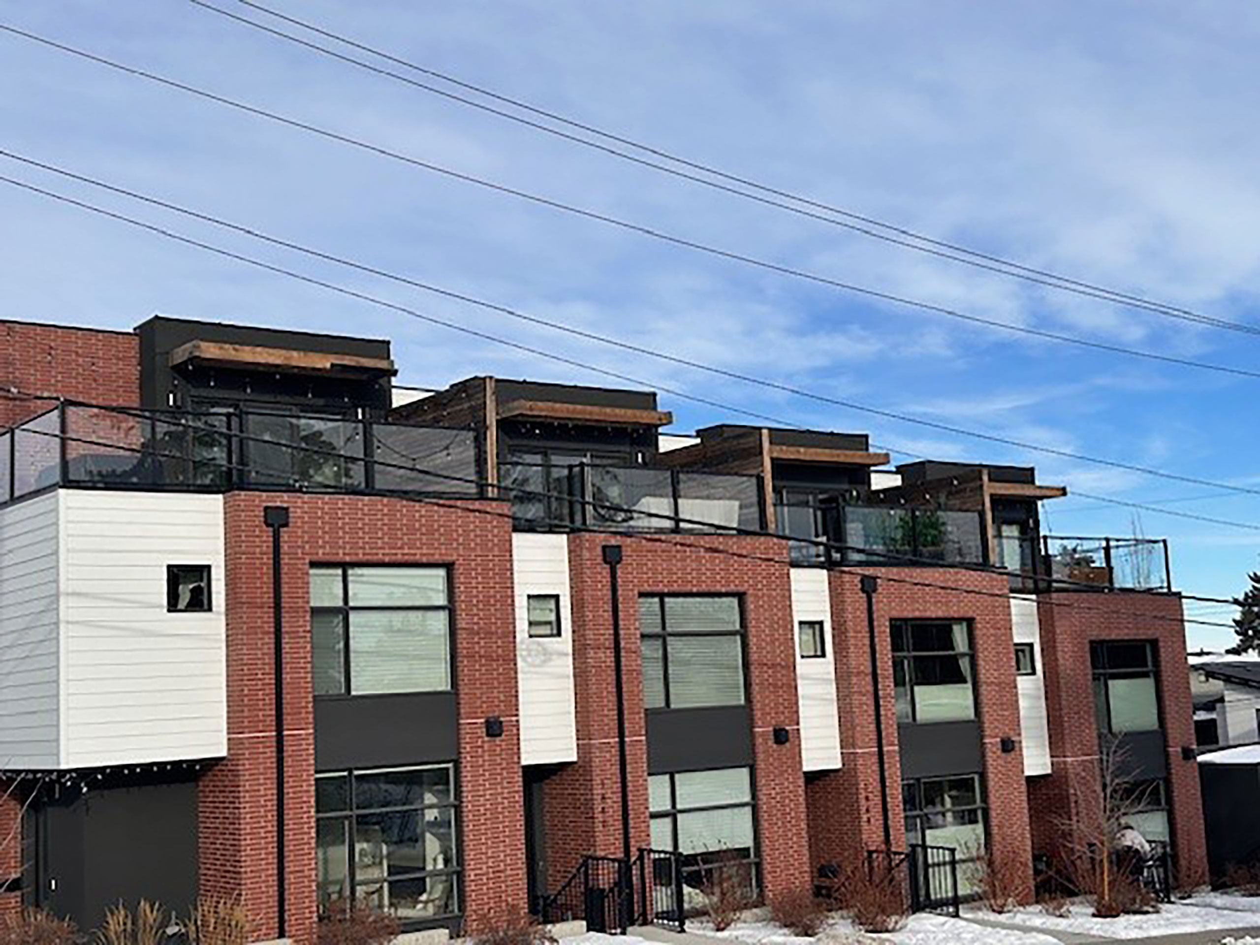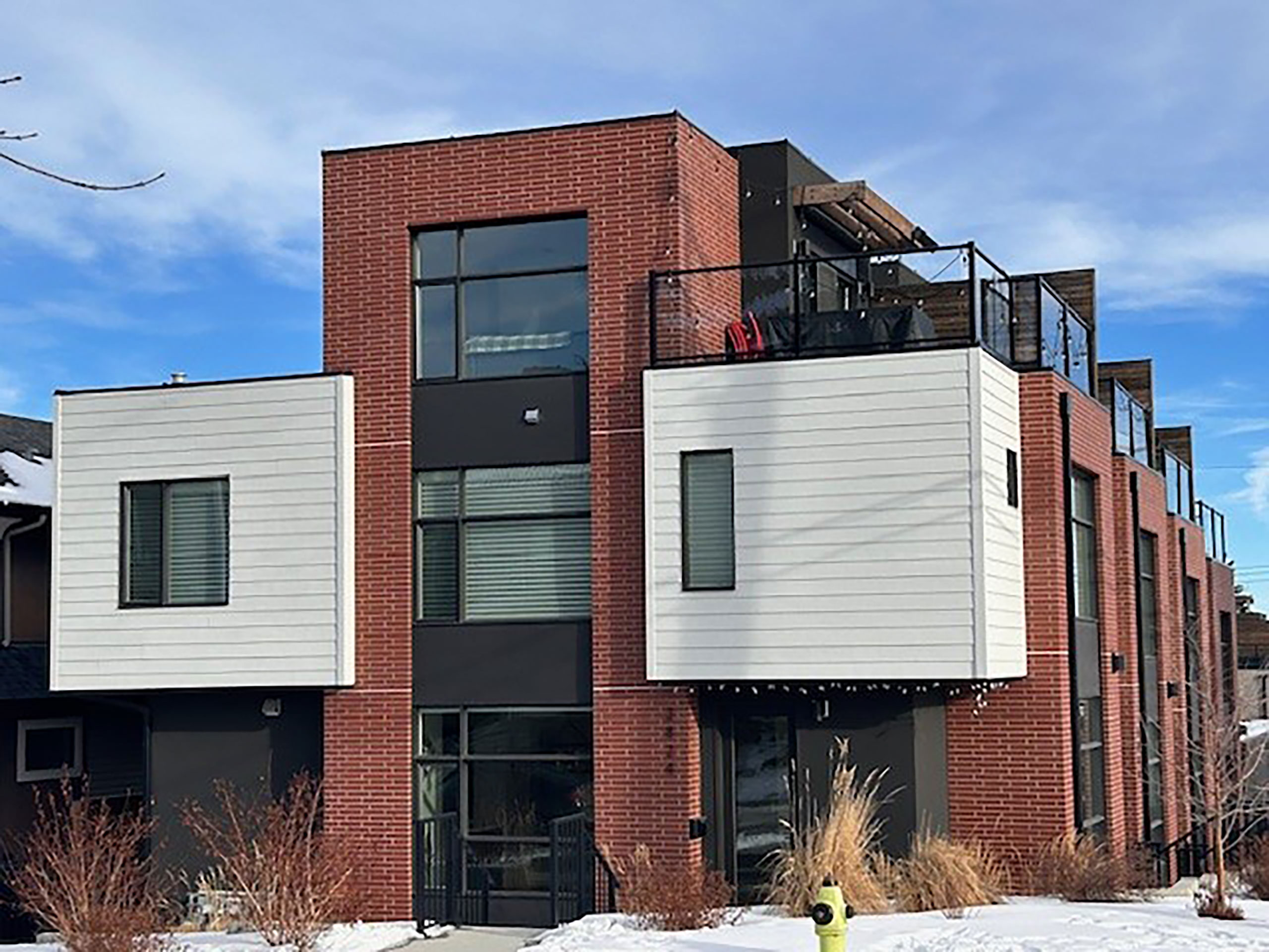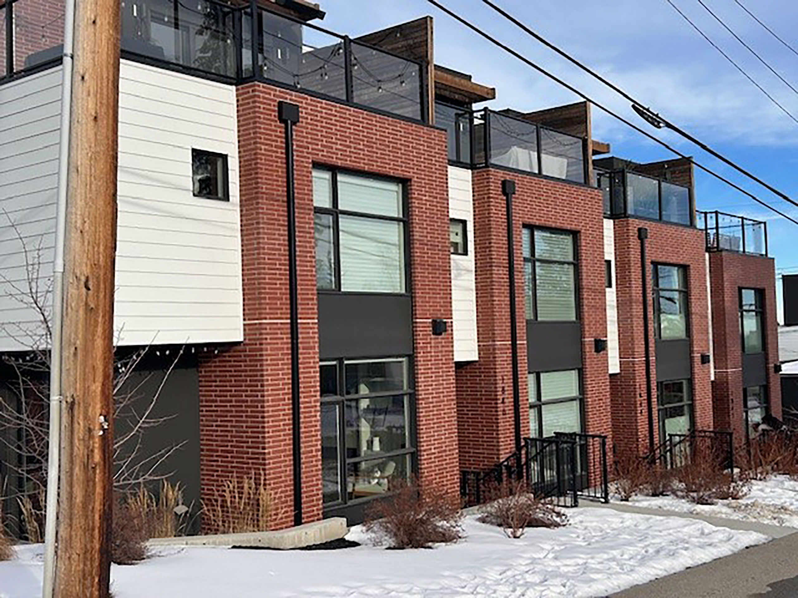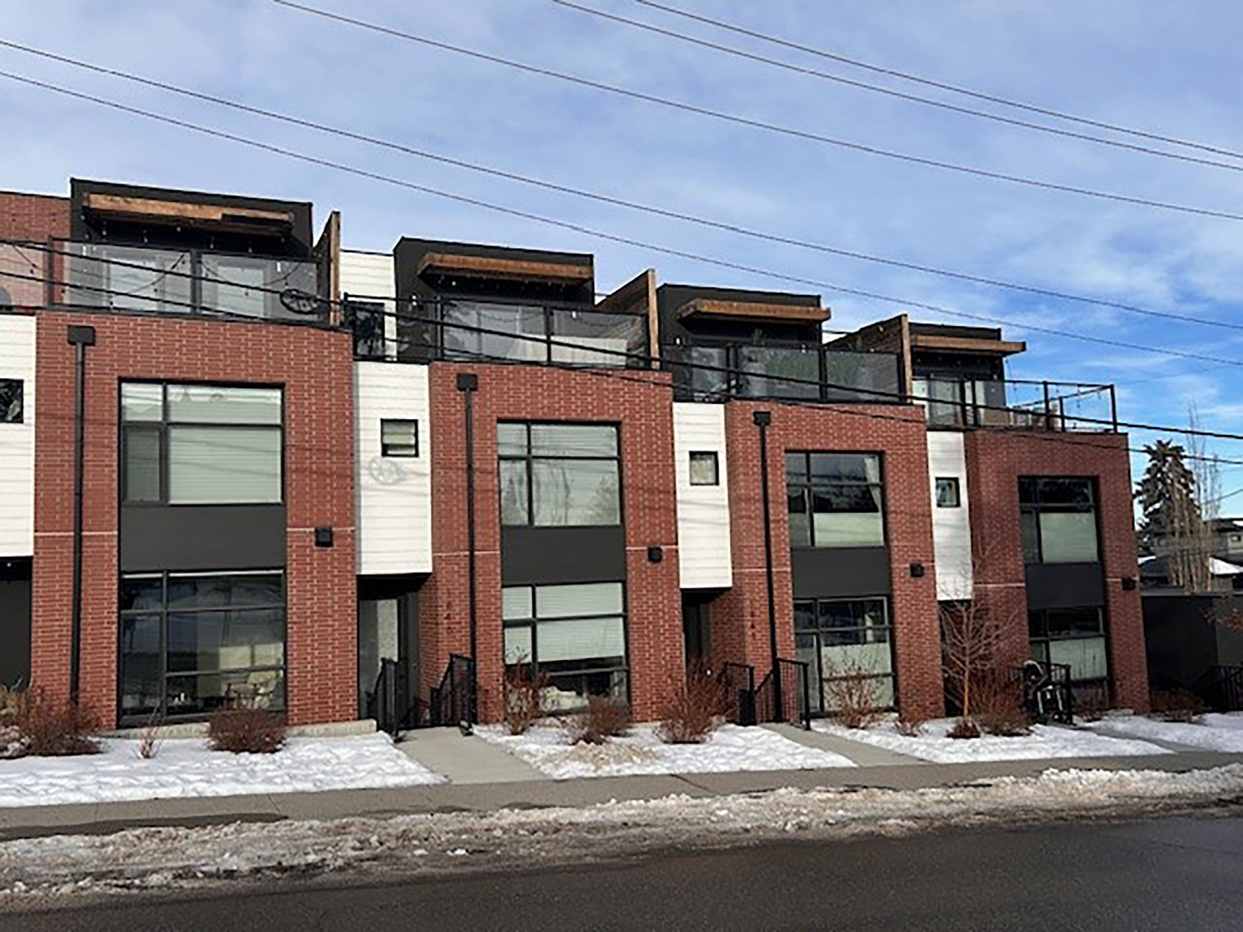 Indulge in breathtaking mountain views from the heart of Altadore with these exquisite luxury fourplex residences. Nestled in this picturesque location, these small multi-residential developments, designed as rowhouses, gracefully slope down to the east and north, creating a harmonious integration with the natural landscape. A striking feature of these residences is their adaptation to the terrain, with each unit boasting unique main floor elevations, showcasing a creative and innovative approach to infill design challenges. In crafting these homes, a modern-sized length of brick was selected—specifically, the timeless Norman brick, distinguished by its beautiful, rich red hue in Hebron Garnet. The brick cladding, modest front stoops, and repeated facades suggest east coast brownstone architecture, but the tectonic massing and contemporary interior spaces reveal this design to be thoroughly modern. This deliberate choice not only contributes to the aesthetic appeal but also serves as a testament to the commitment to quality and design excellence. As you traverse 17th Street SW, this fourplex commands attention and stands as a symbol of architectural distinction.