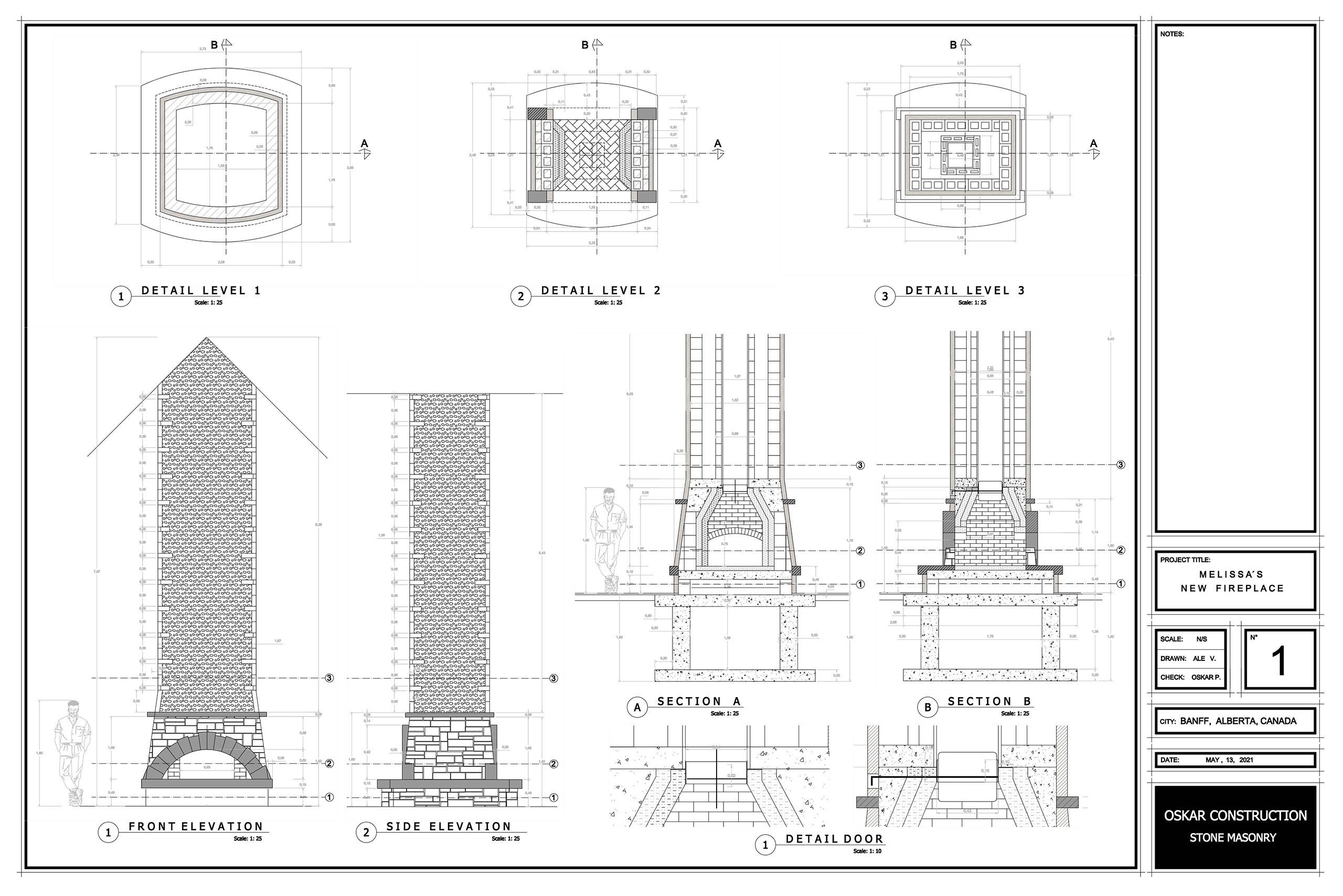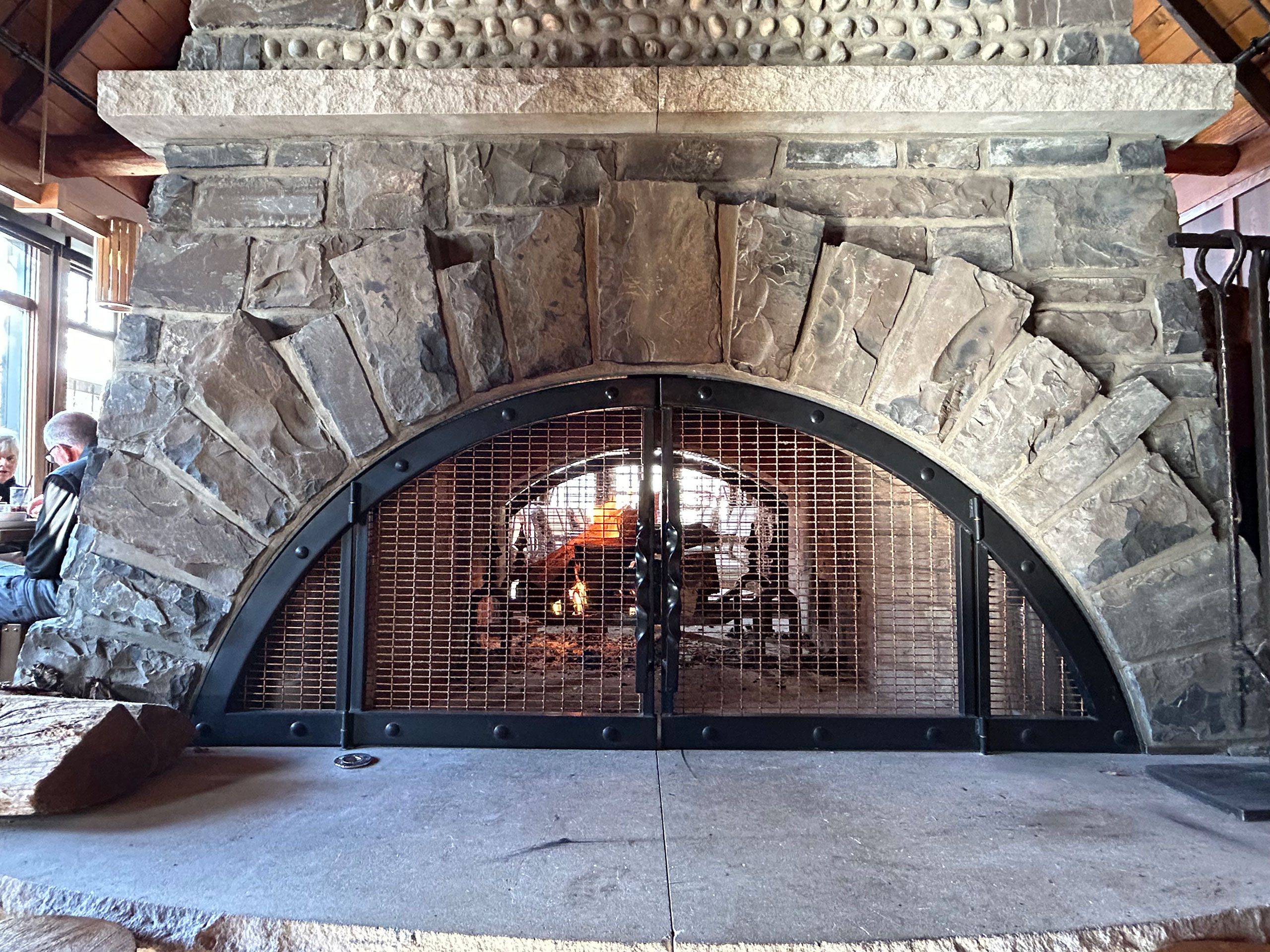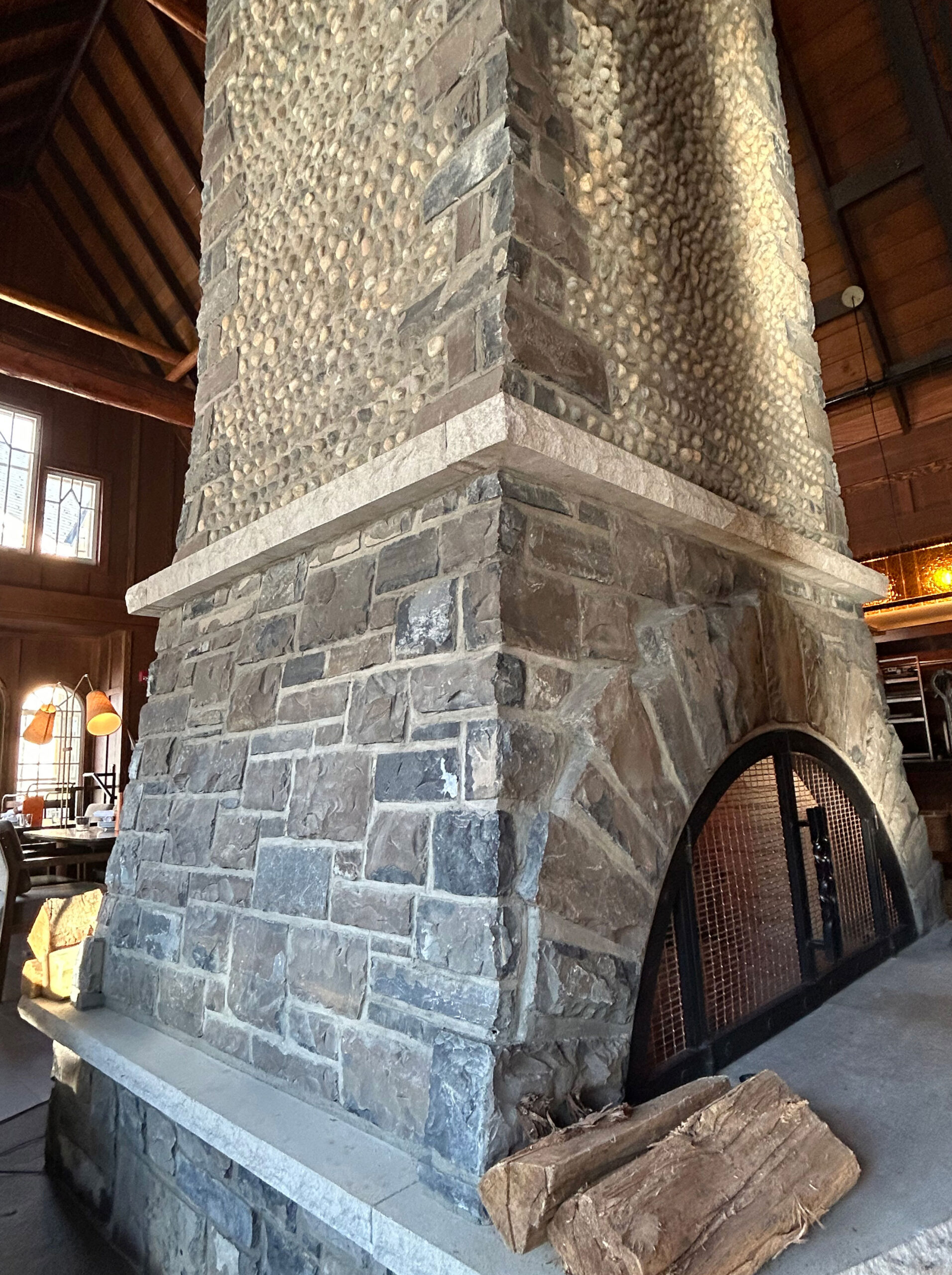 At the centre of Bluebird’s main dining space is an expansive, hand-laid stone fireplace that extends to the vaulted ceilings. The stonework is an eclectic, imperfect mix of hand selected river rock in varying sizes and salvaged rundle stone, reminiscent of the iconic Bow River Bridge stonework. The double-sided wood burning fireplace grounds the main dining space and brings connection to the diners seated on the upper-level Juliet balcony. The beautiful craftmanship of the fireplace pays homage to the original 1930s building. It is a full structural masonry project which was designed with cinder block, firebrick and stone on a concrete foundation. The biggest challenge was fitting it into the space.