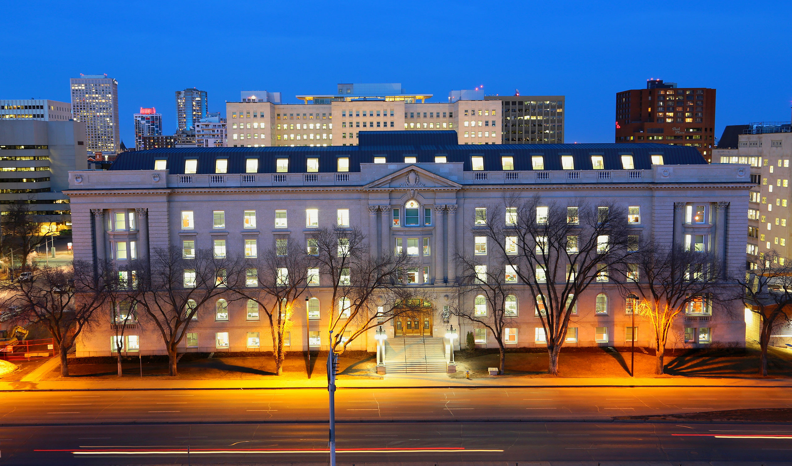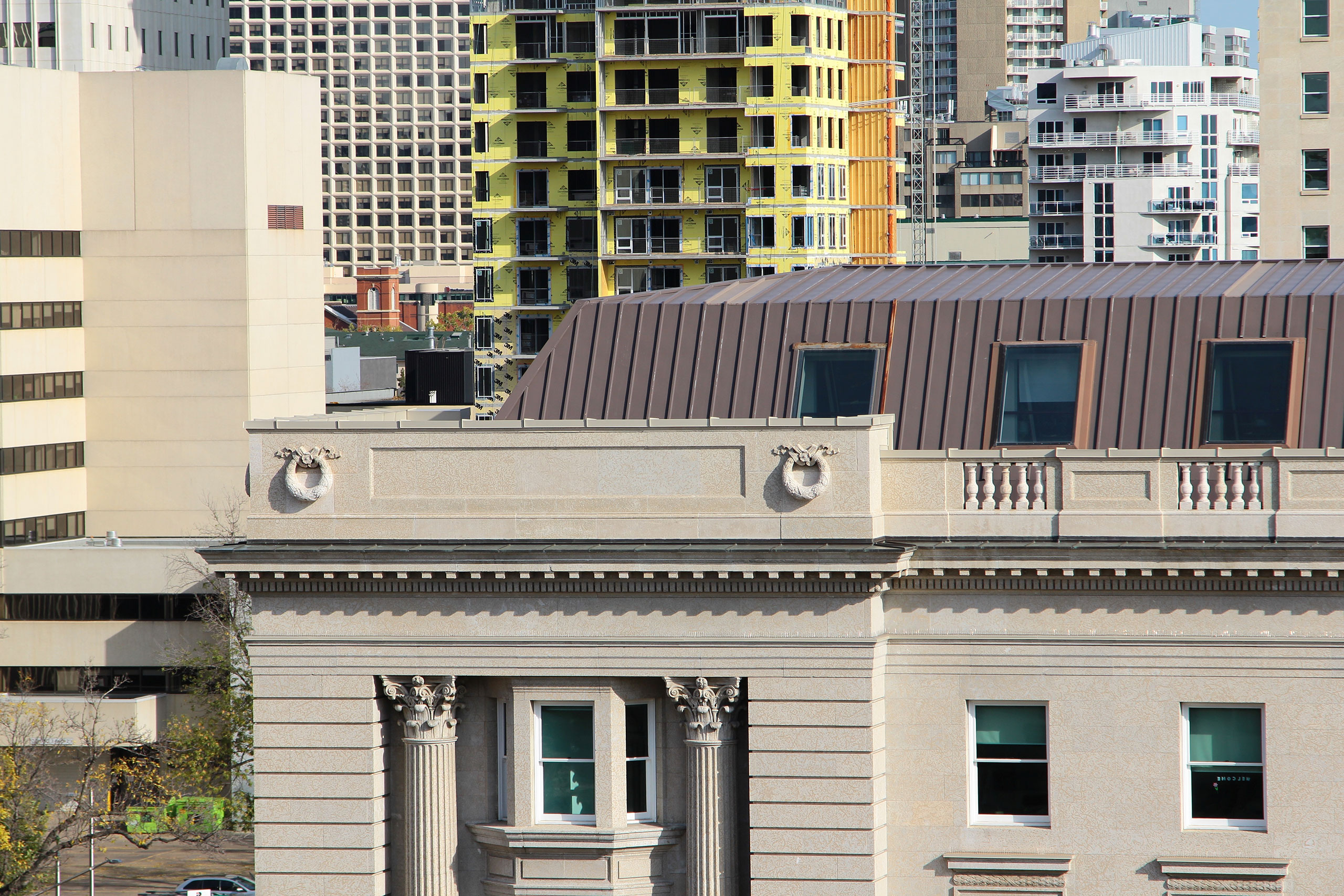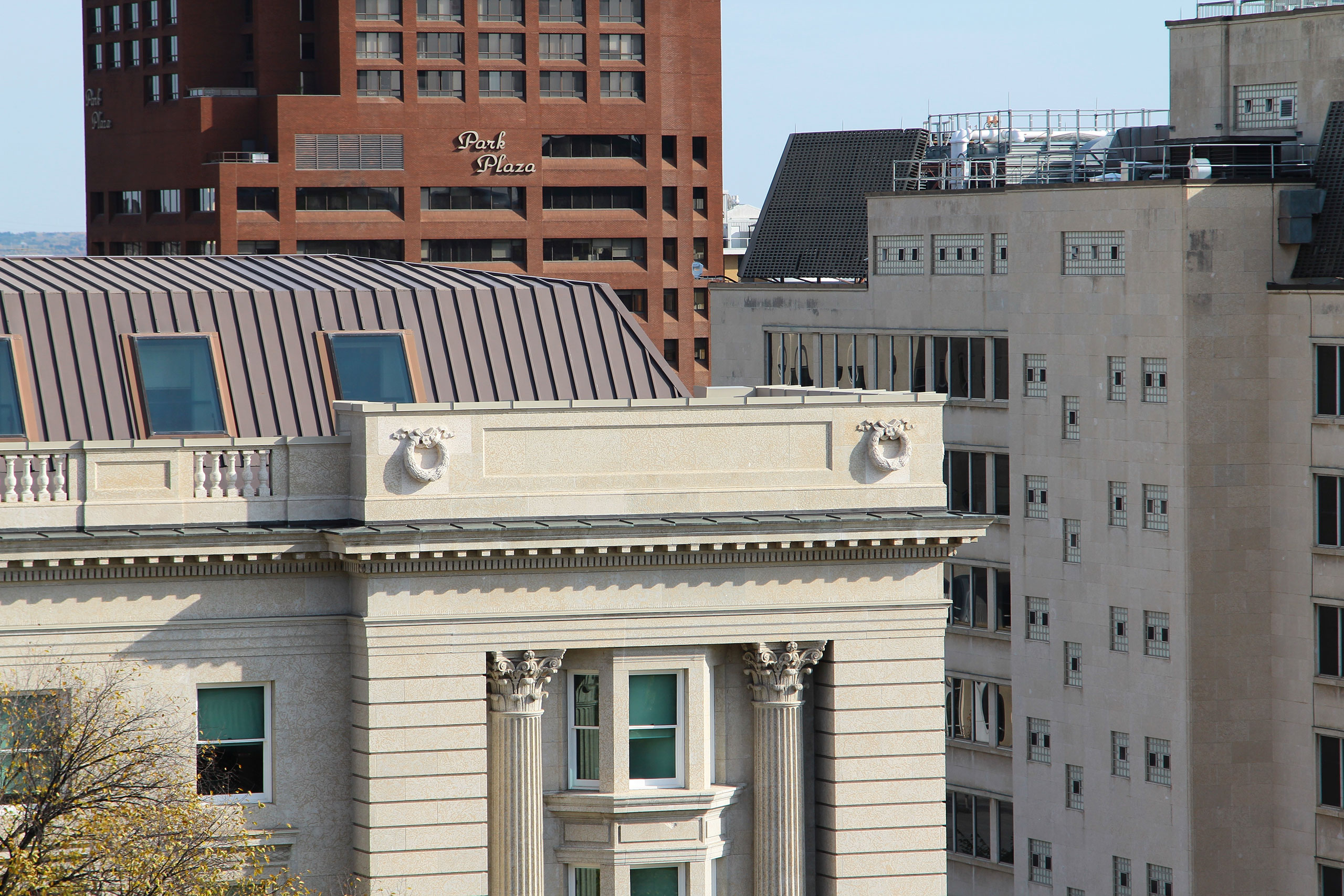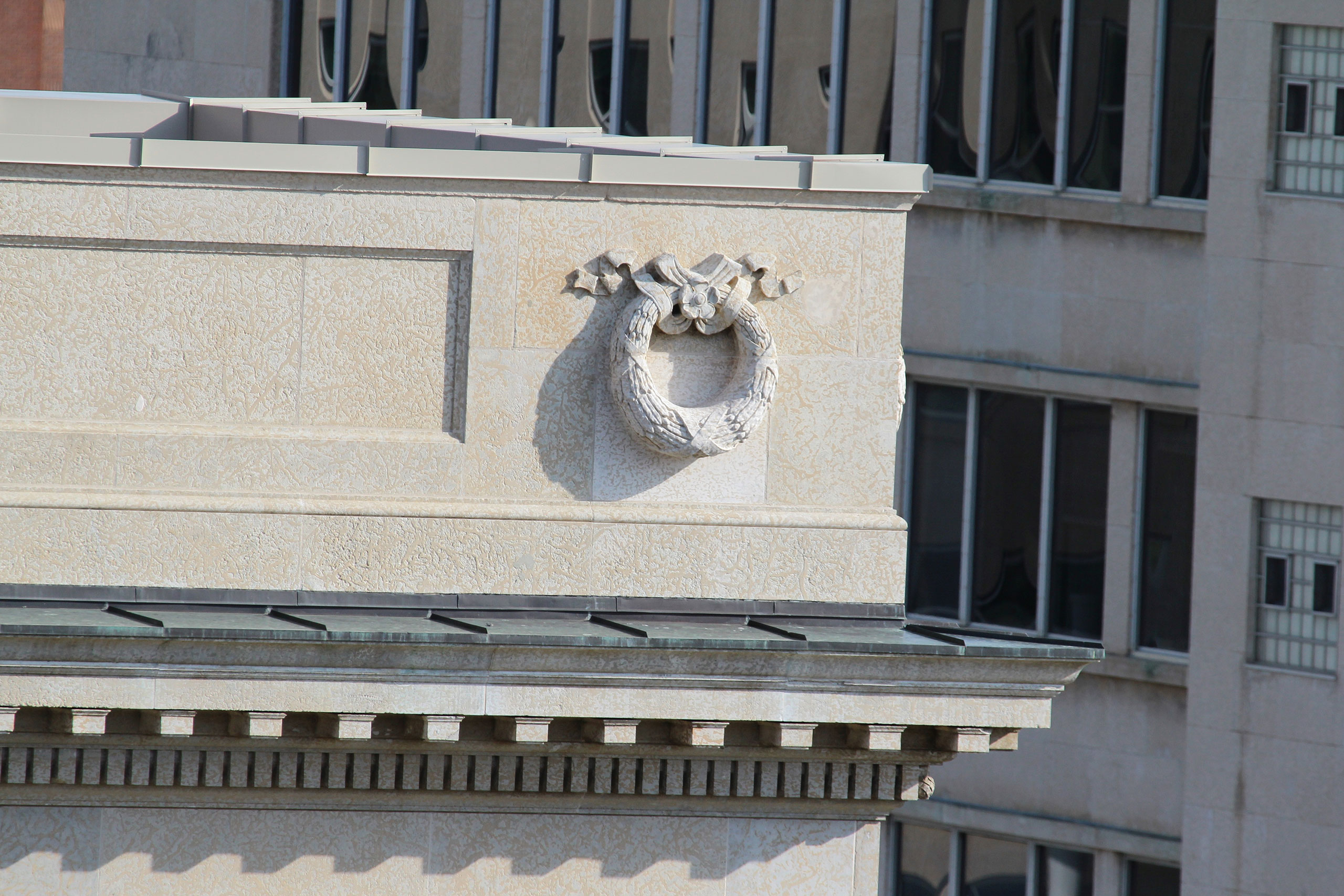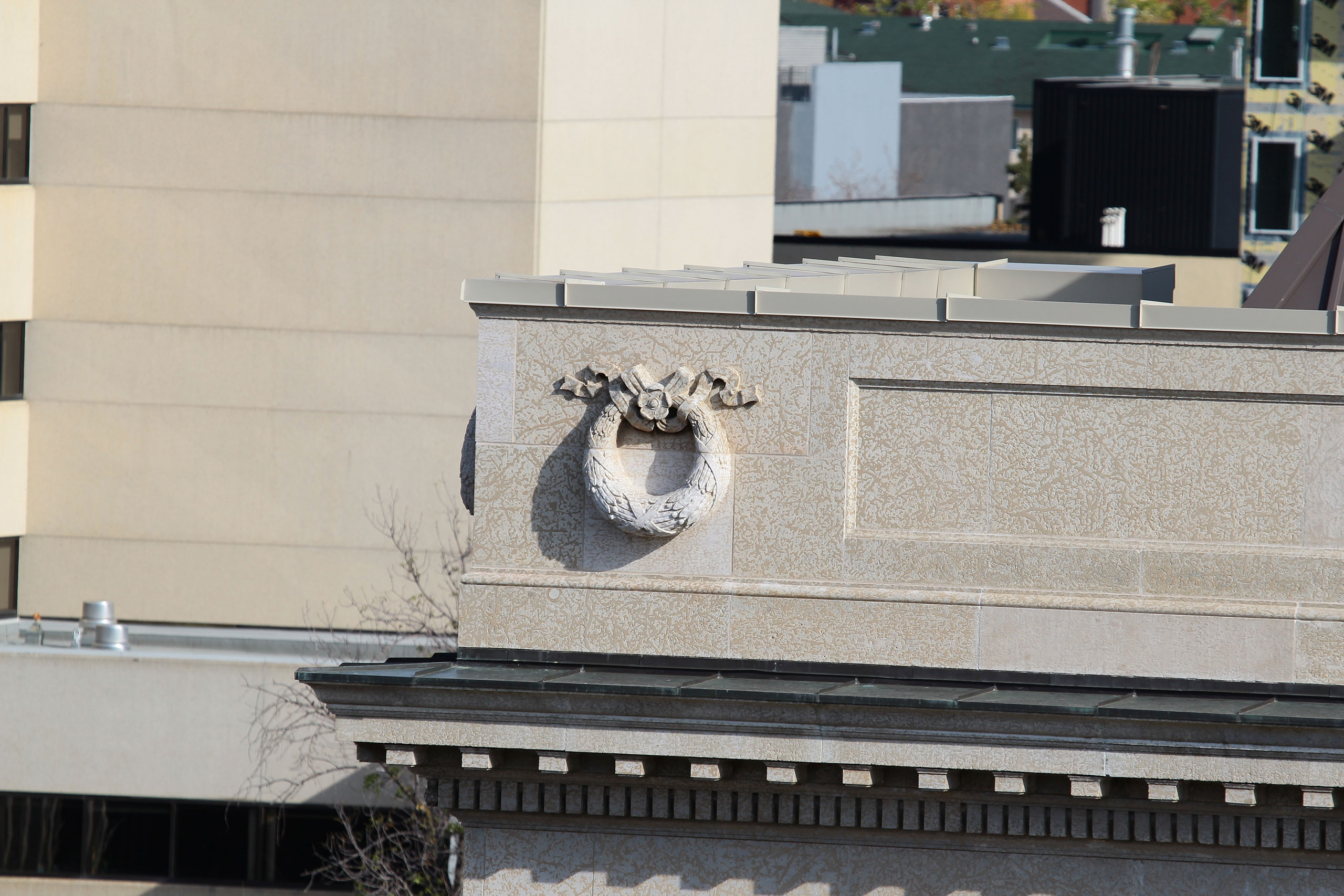 Built in 1931, this structure was originally known as The Administration Building. The exterior cladding is constructed with Tyndall Limestone and a brick back-up wall system. This restoration project consisted of addressing all structural stone repairs, removing damaged decorative wreaths, water-table units, lintels, and ashlar units. Additional moisture management elements were installed to prevent future damage. Repointing of mortar joints, rebuilding of brick back-up as required and installation of bird control devices were also incorporated. The underpinning of the East & Main stairs consisted of the removal & resetting of the concrete base and granite treads.