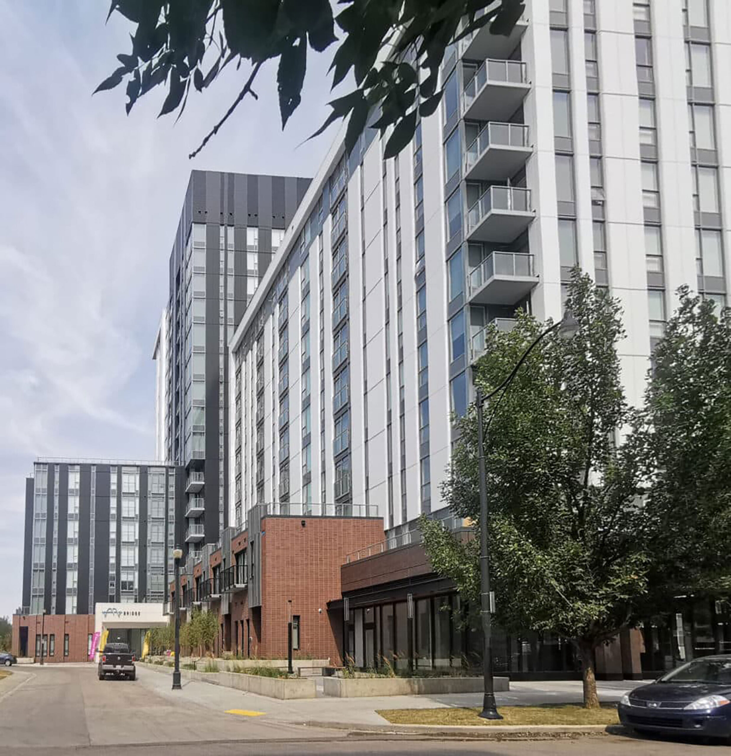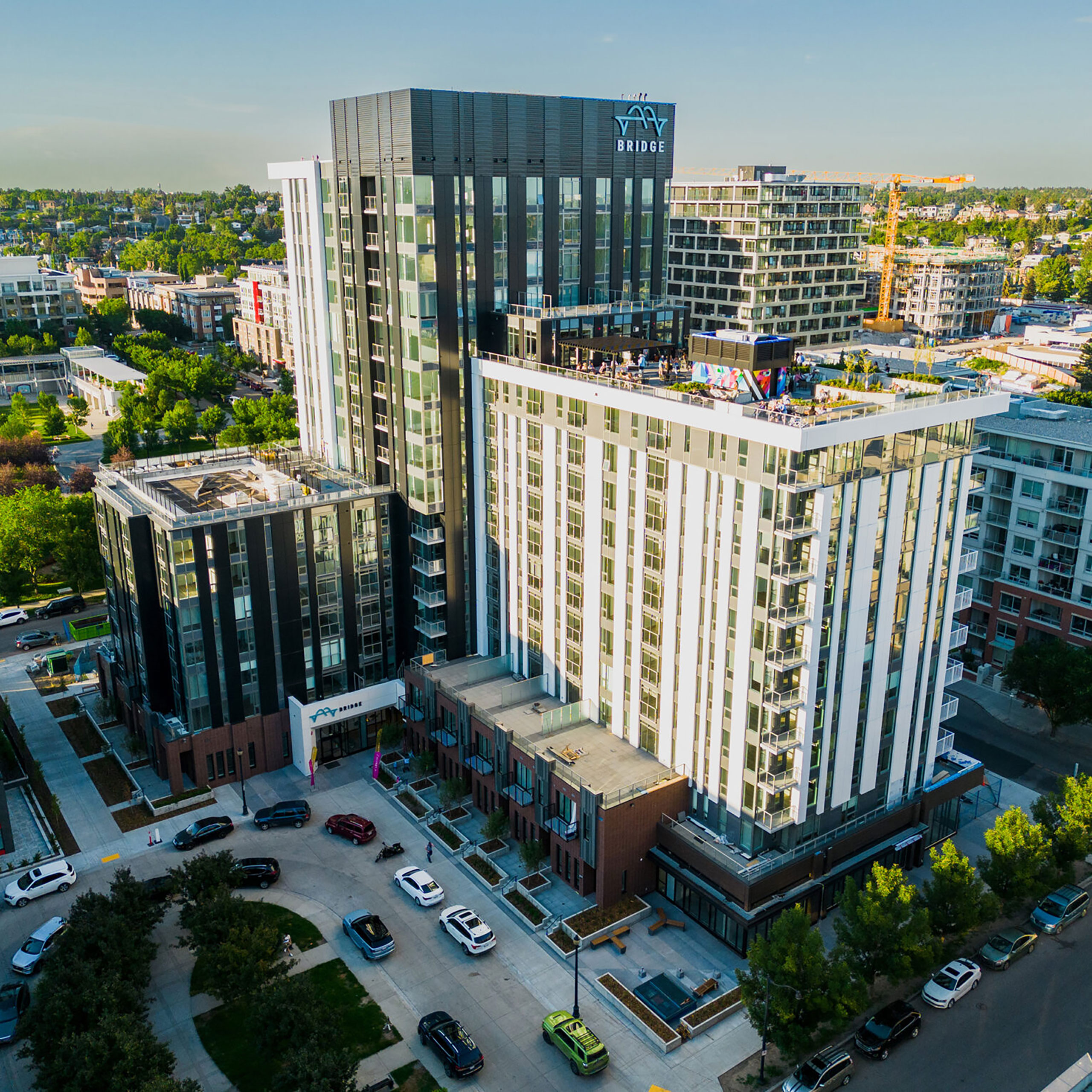 The Bridge is a 16-storey mixed-use residential tower that offers retail at grade along with 285 purpose-built rental suites. This thoughtfully designed, multi-tiered development embodies holistic design using strategies of context-based massing and façade treatments to foster a healthy community and an active urban environment. This project supports the ongoing effort to increase density and provide a place where people can live, shop, dine, work and connect all in one area.