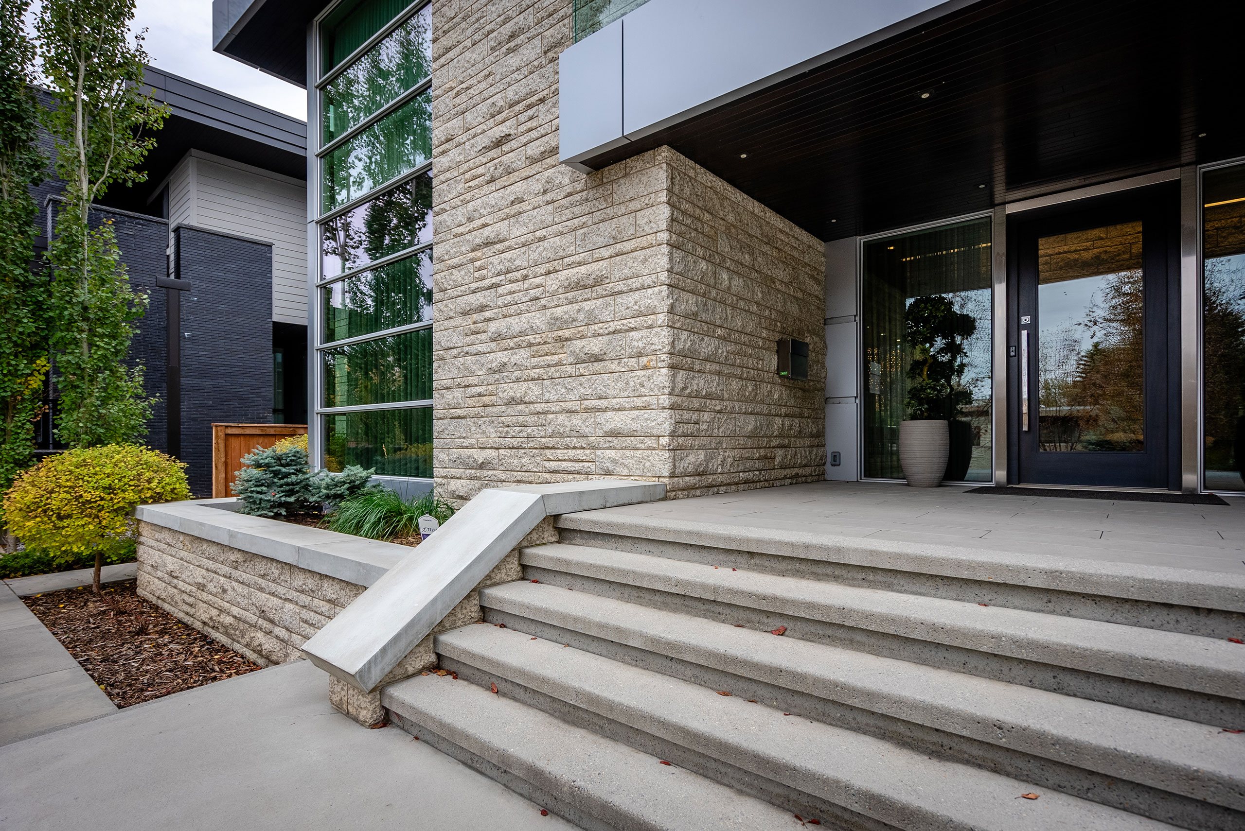 Corse Construction considered every single small detail during this project. This included the use of laser levels to ensure that every course of stone was perfectly in line with every other stone wall throughout the entire property. Powder coated Z-bar angle iron was installed at the sloped driveway with such precision that a 10mm space between the stone and concrete was absolutely consistent.