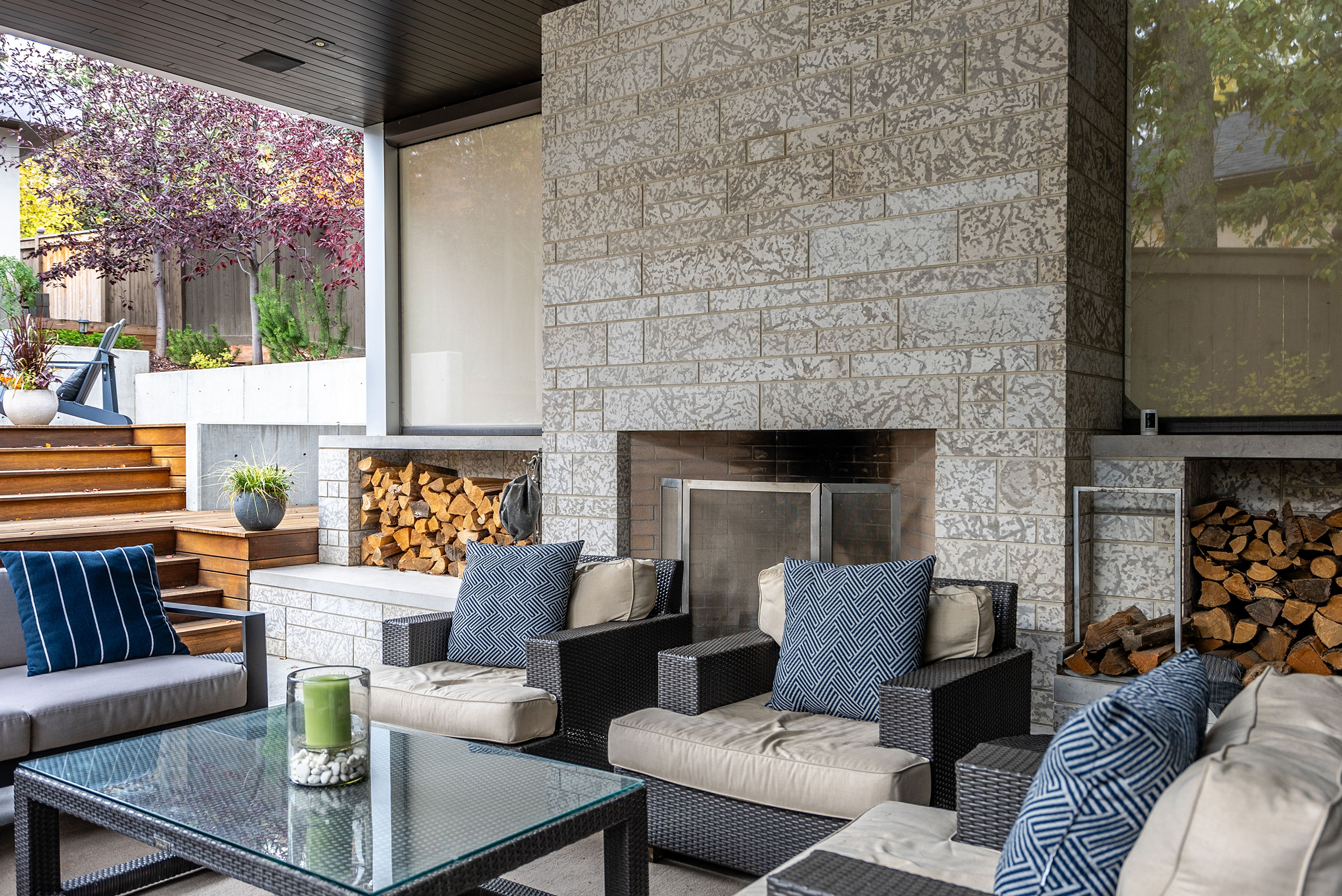 The Britannia Tyndall Stone custom home is a step beyond conventional building practices. The design incorporated a balanced blend of rubbed and split faced full bed Tyndall stone on the exterior and interior, outdoor kitchen, and 60″ outdoor masonry fireplace.