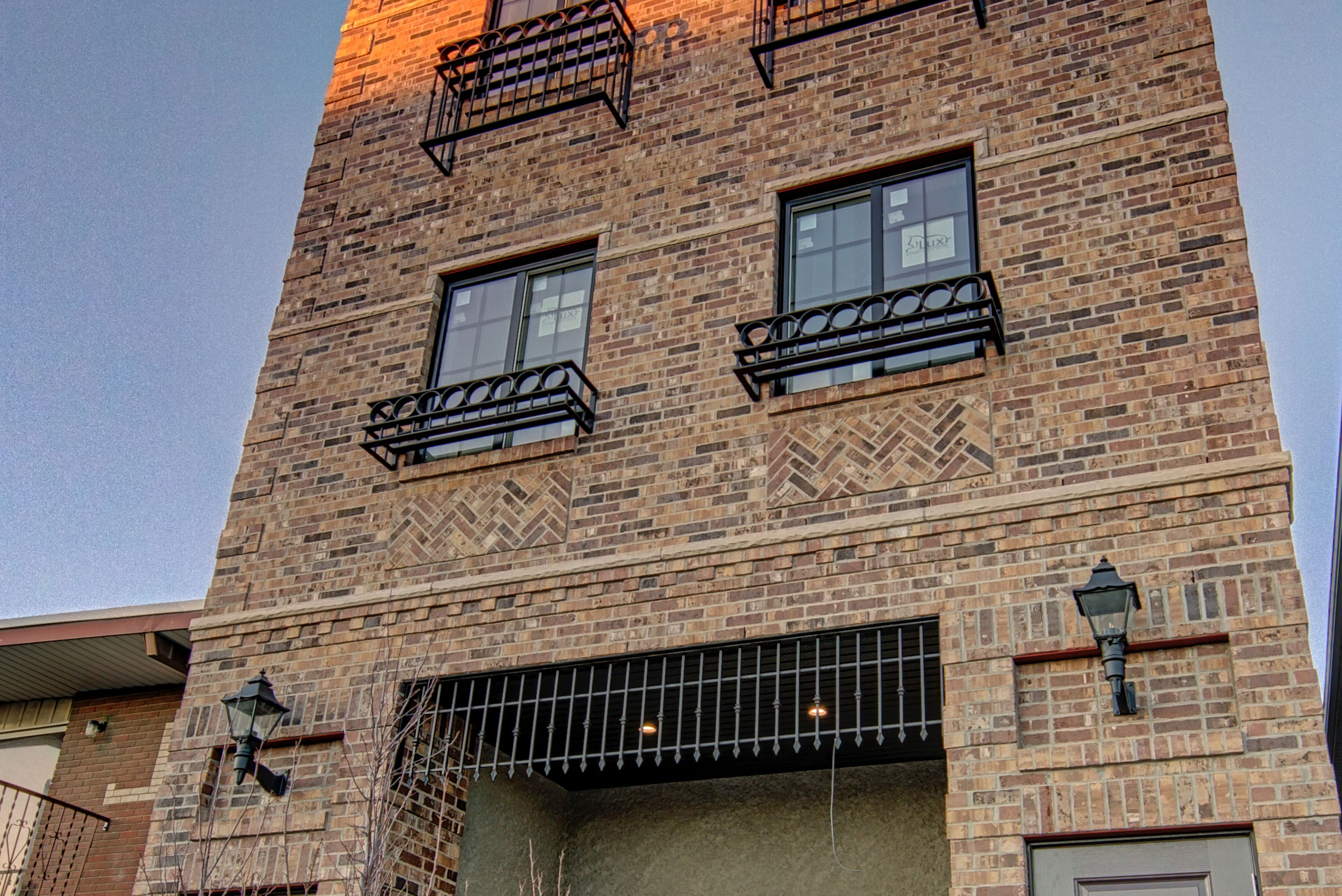 Combinations of coursing has been used on this Infil – running bond for the main brick pattern was combined with stacked bond and herringbone pattern in some sections. Several design elements were also incorporated into the brick layout – soldier coursing, row locks, quoins, and single unit texturing.