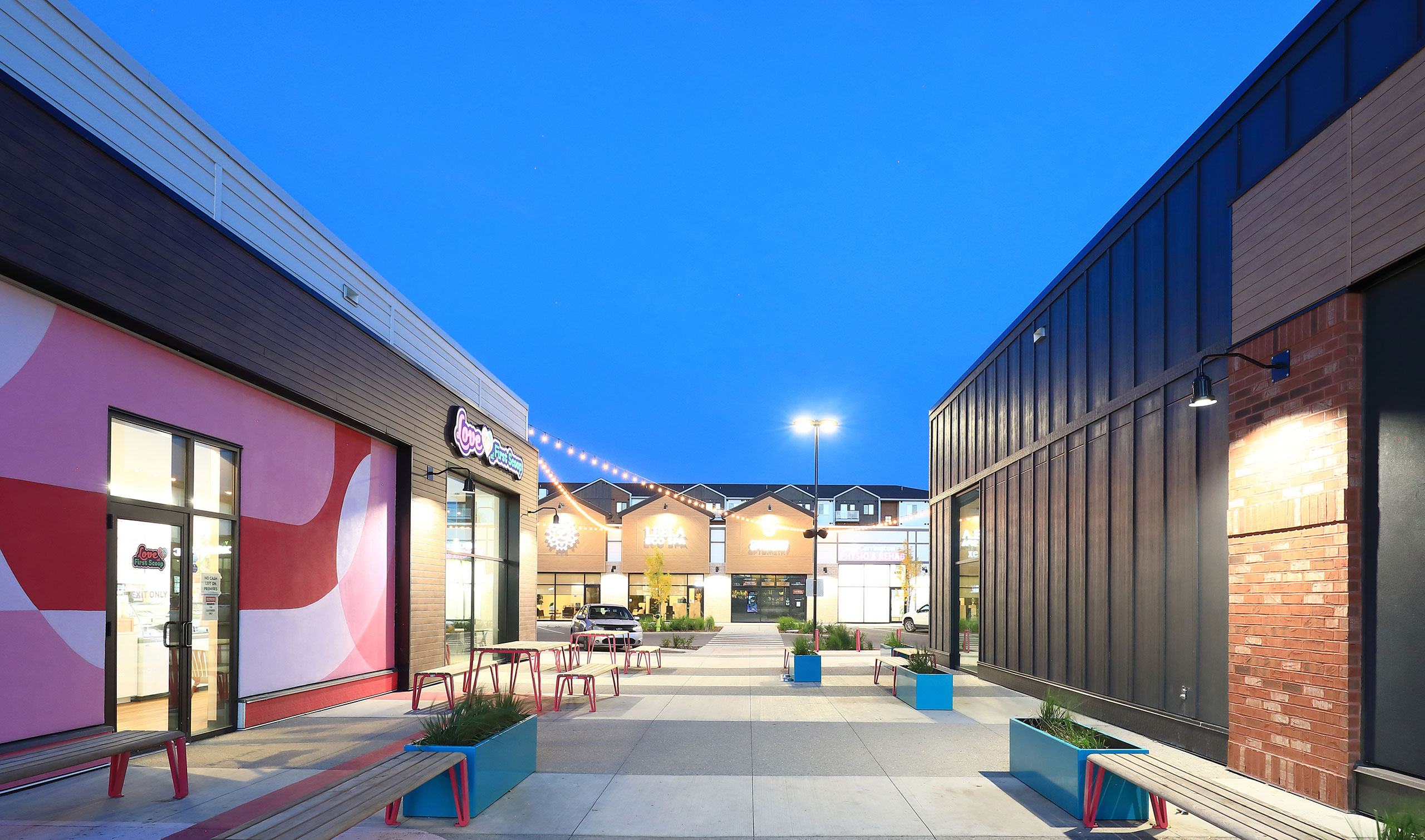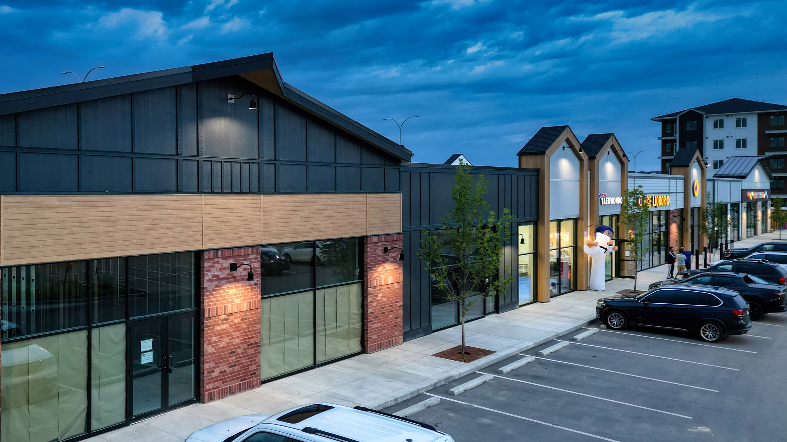 The stylistic direction requested by Royop was for a “contemporary country” aesthetic. This presented challenges in terms of achieving the stylistic goals without becoming kitschy or utilizing overtly “traditional country” detailing. To this end Systemic resolved a series of design elements anchored under traditional roof forms: these forms mix traditional board and batten wood and brick materials with modern glass storefronts. Specific attention was given to the use of a limited amount of a distressed wood aesthetic in feature areas. The brick was non-structural, however served a critical role in the achieving the balance of these traditional cues with a modern, crisp commercial aesthetic.