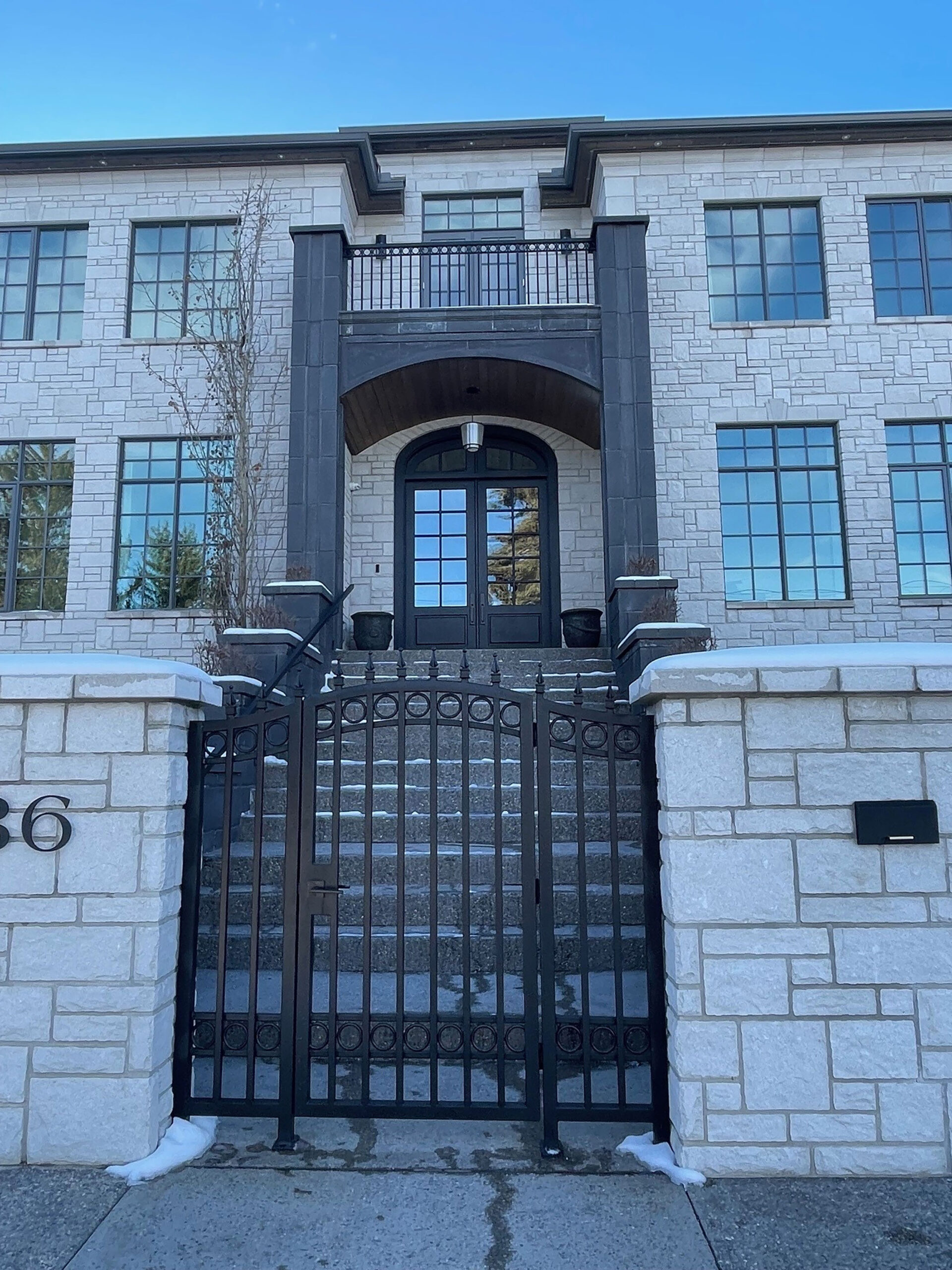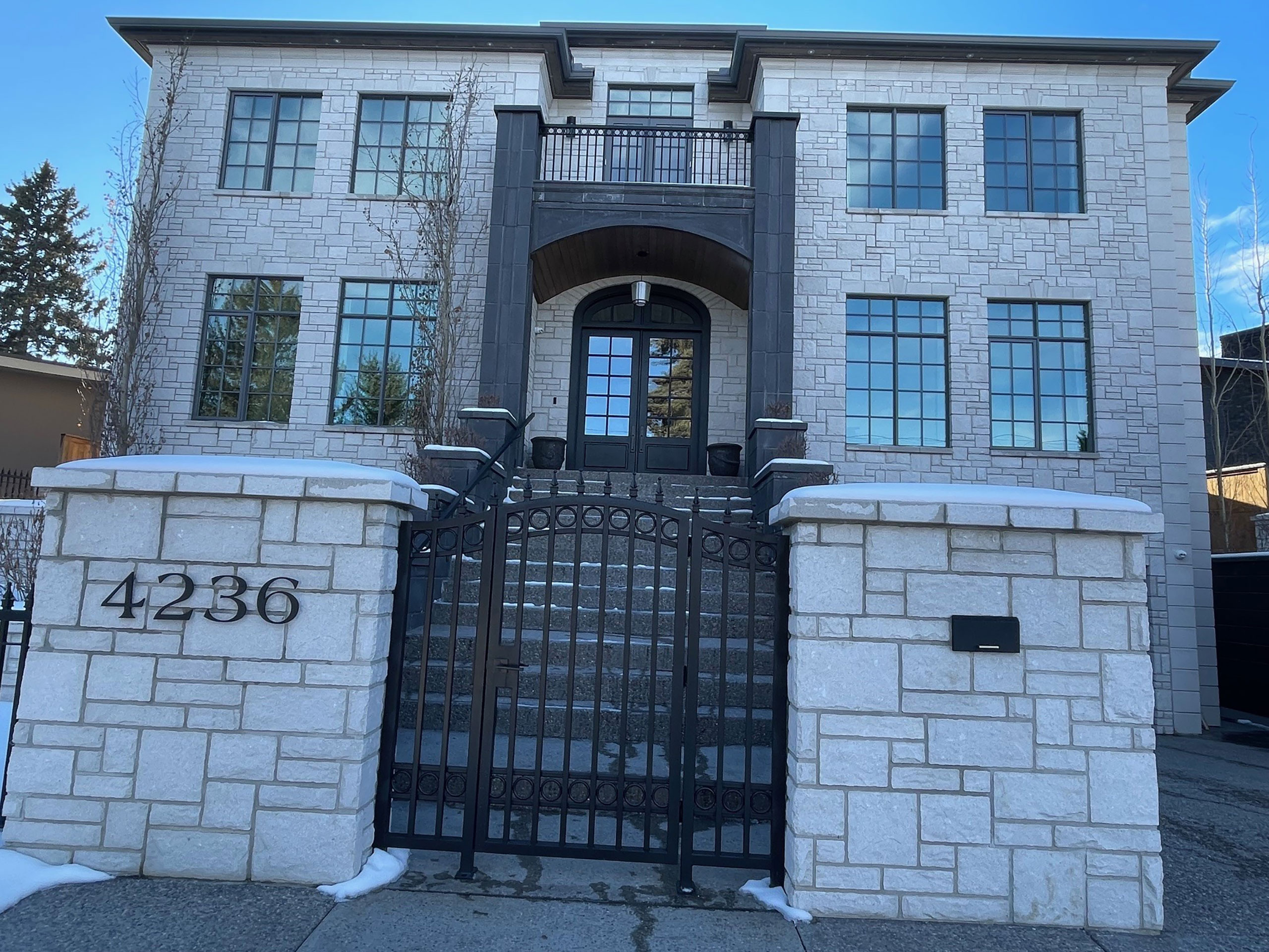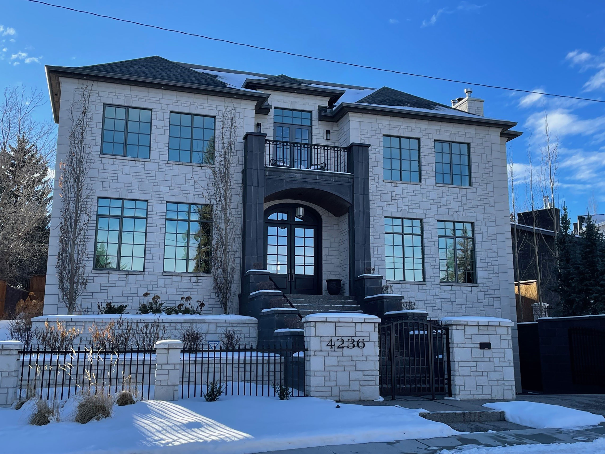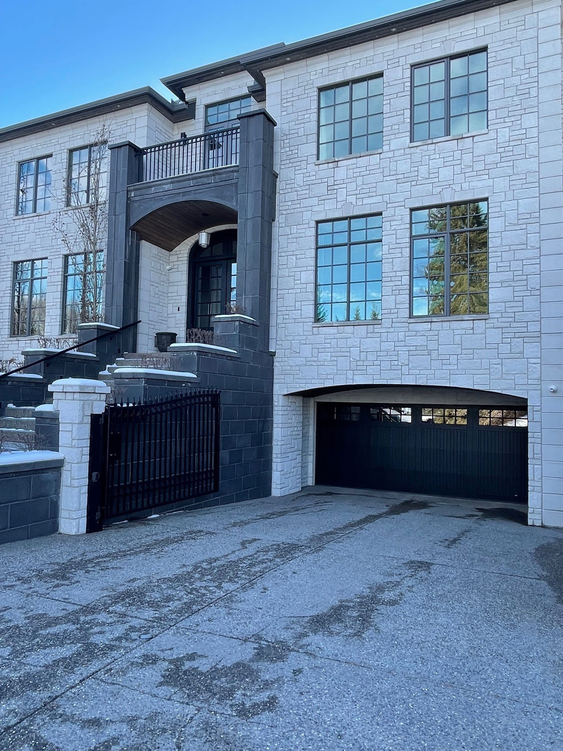 This exquisite residence exudes timeless elegance, boasting a captivating old-world charm inherent in its Georgian Home Design. Adorned with Shouldice Designer Stone, specifically the illustrious Roberval Estate stone, this home effortlessly distinguishes itself from its peers. Crafted from high-end concrete, the stone emulates the allure of natural stone while maintaining an air of refinement with its uniform white hue. Meticulously detailed with stone arches, keystones, trim, post caps, and complemented by stately dark pillars at the entrance, this residence exudes sophistication. Notably, the classic incorporation of quoins along the corners adds a touch of architectural grandeur. Truly, this is the epitome of a dream home.