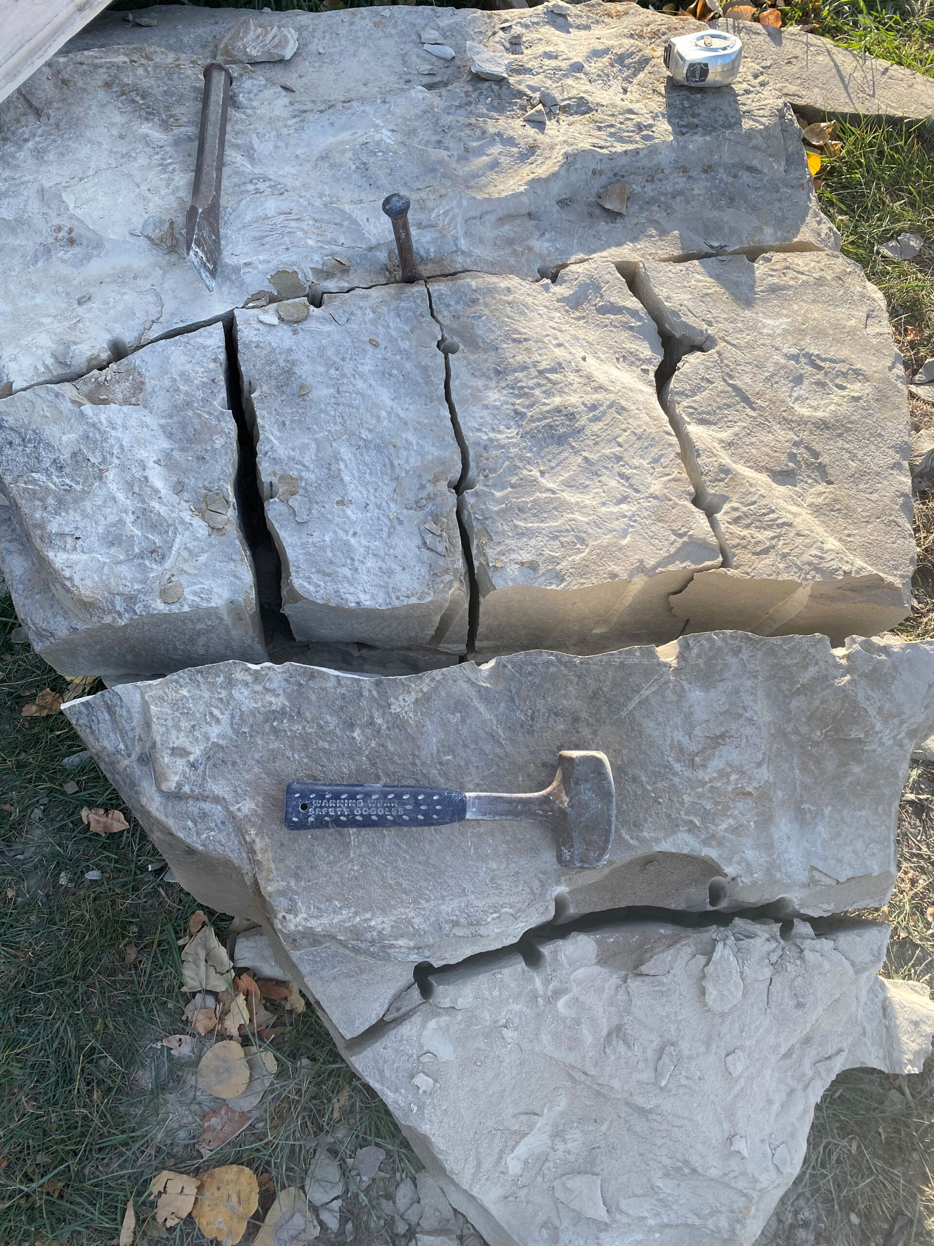 Photo 3- New sandstone blocks for foundation were broken down using plug and feathers.Then the face had to be pitched to remove the drill holes.