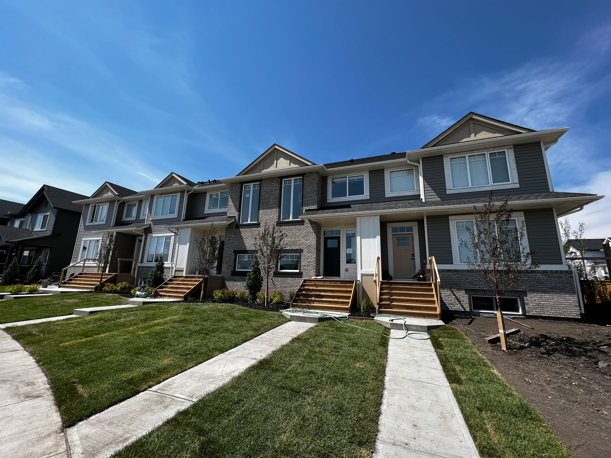This project was done in the willows in Cochrane Alberta in 2023. For Kingsmith builders.It is a town house complex. Took me and one other bricklayer two weeks from start till finish to complete this project. Brick laid is called Thundercloud. Trim brick were done in Ebony supplied by Brock white. Details in brick would be soldiers and rowlocks around windows done in the ebony and rowlocks going all around the complex. Mortar used was sand and type N mix. Standard 4×4 angle iron. Project was gauged perfectly cuts are flawless. Bricks laid straight and plumb. Should last for years to come.