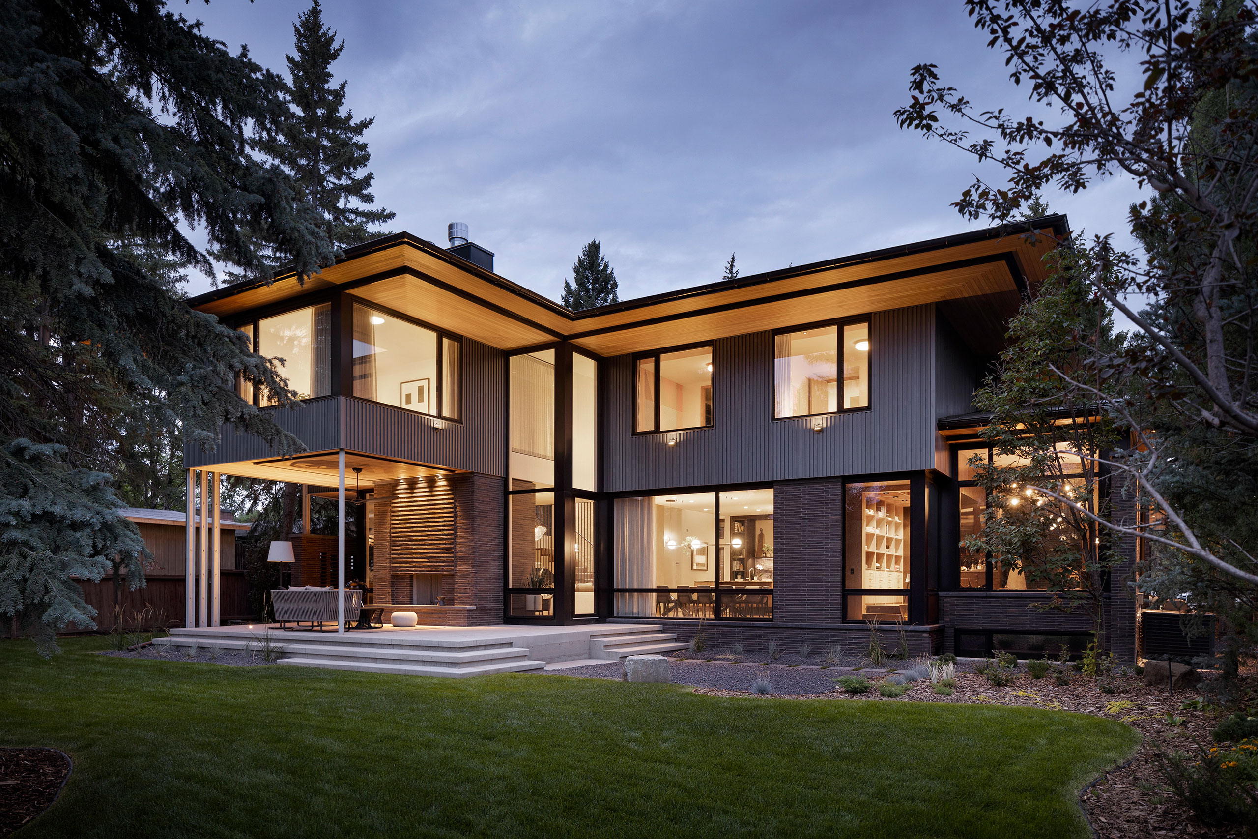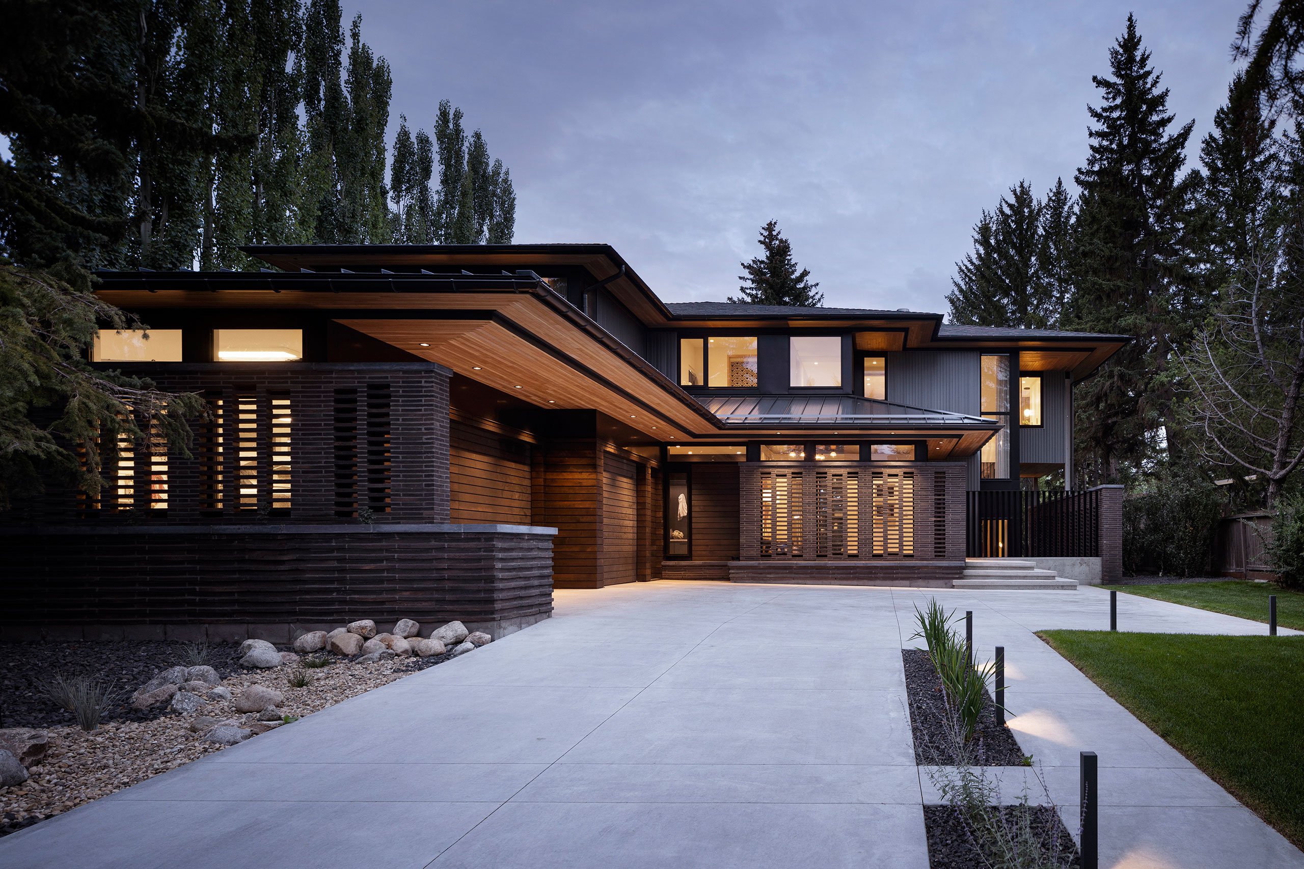 Keel Architectural Products provided Randers Tegl Ultima RT 161 brick from Europe. The unique brick size resonated with the client as it is reminiscent of the long bricks often used in mid-century homes and reinforces the horizontal emphasis used throughout the design. The brick is very long, approximately 20”, and all bricks are solid, which are conducive to the lattice/hit and miss walls. The brick is challenging to work with so craftsmanship is evident. The masonry’s visual interest begins on the driveway where brick planters and the ‘hit and miss’ walls become focal points. These walls have multiple functions: ensuring privacy, light filtration by day, which transforms into visual interior interest by night.