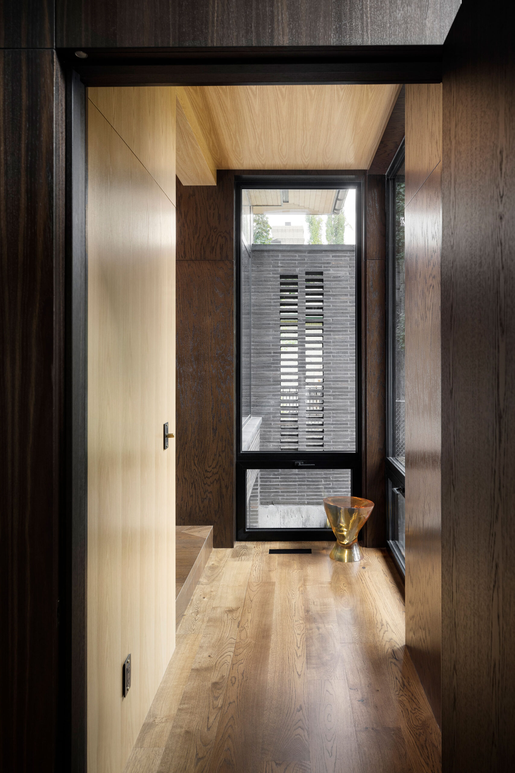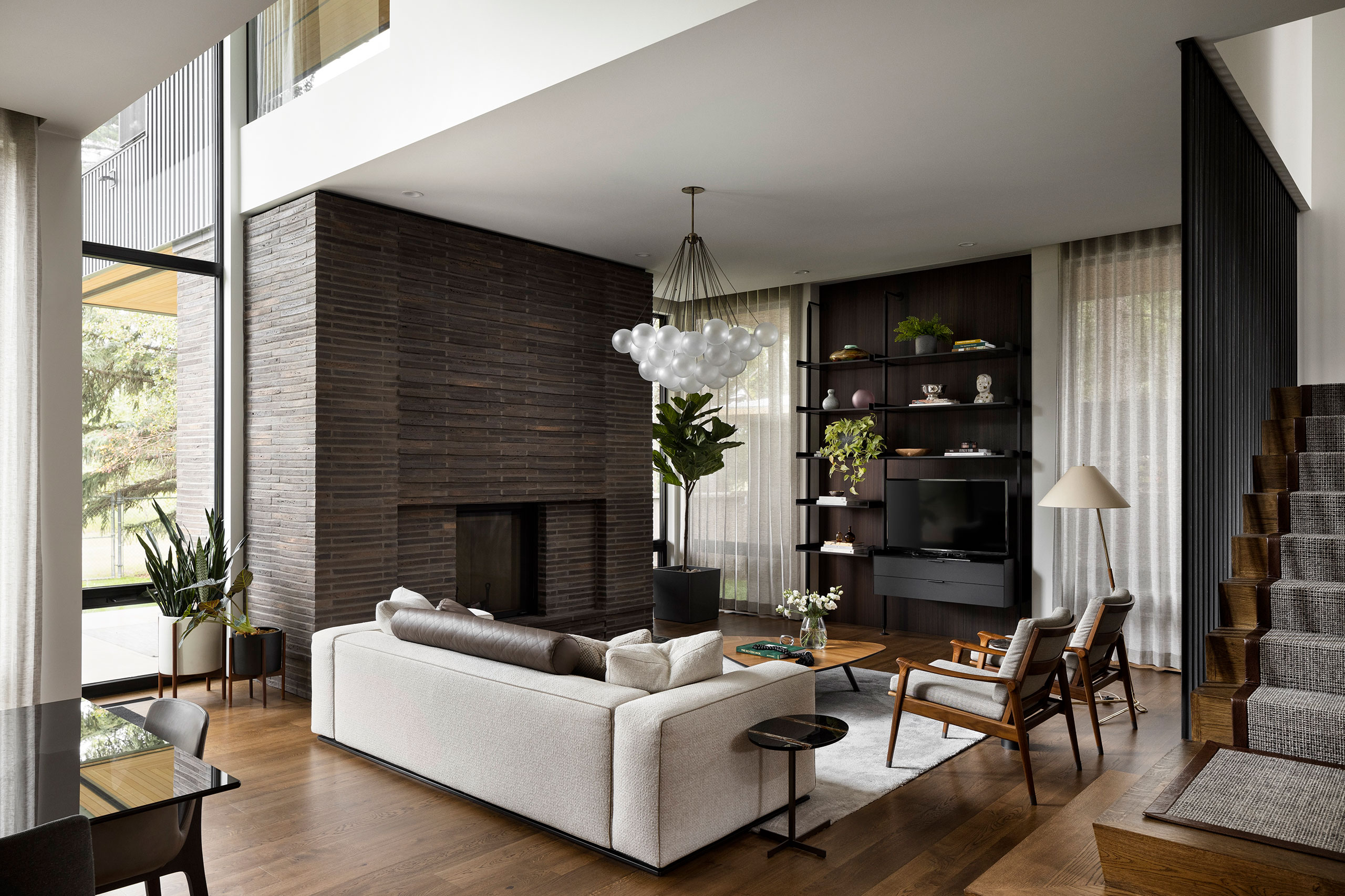 The brick coursing closest to grade is staggered in depth creating a sequencing of protruding and receding brick which adds texture and depth – this aesthetic is also seen on the interior and exterior fireplace walls creating visual continuity.