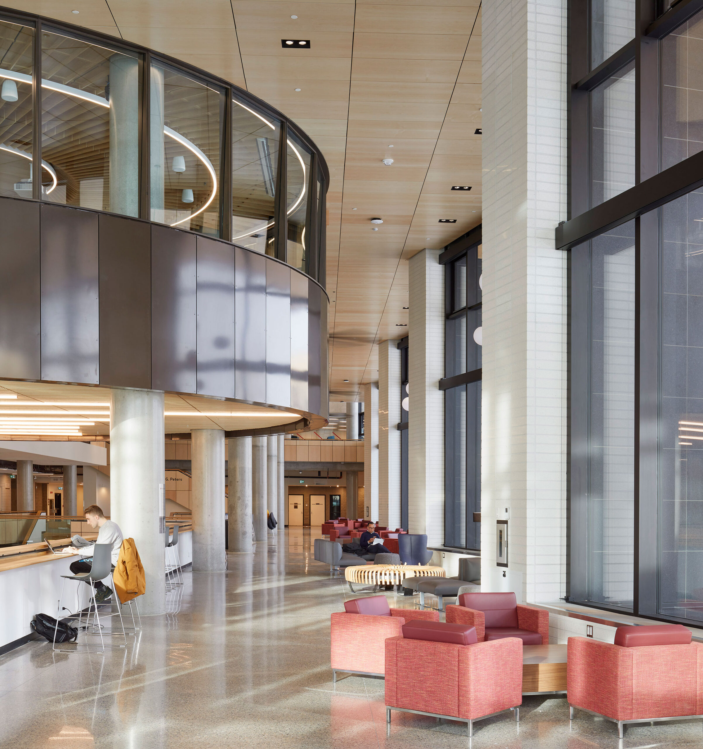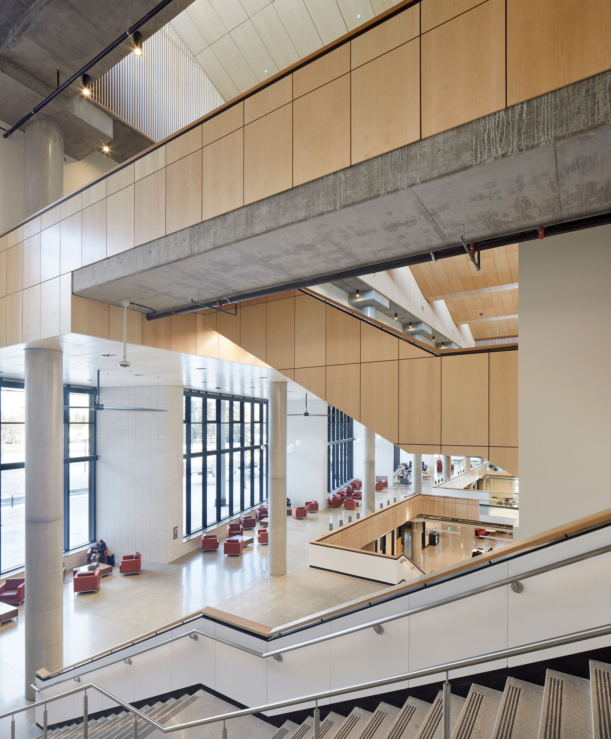 The feature masonry corridors and sawtooth columns are a stacked bond half high Superwhite Honed CMU by Day and Campbell