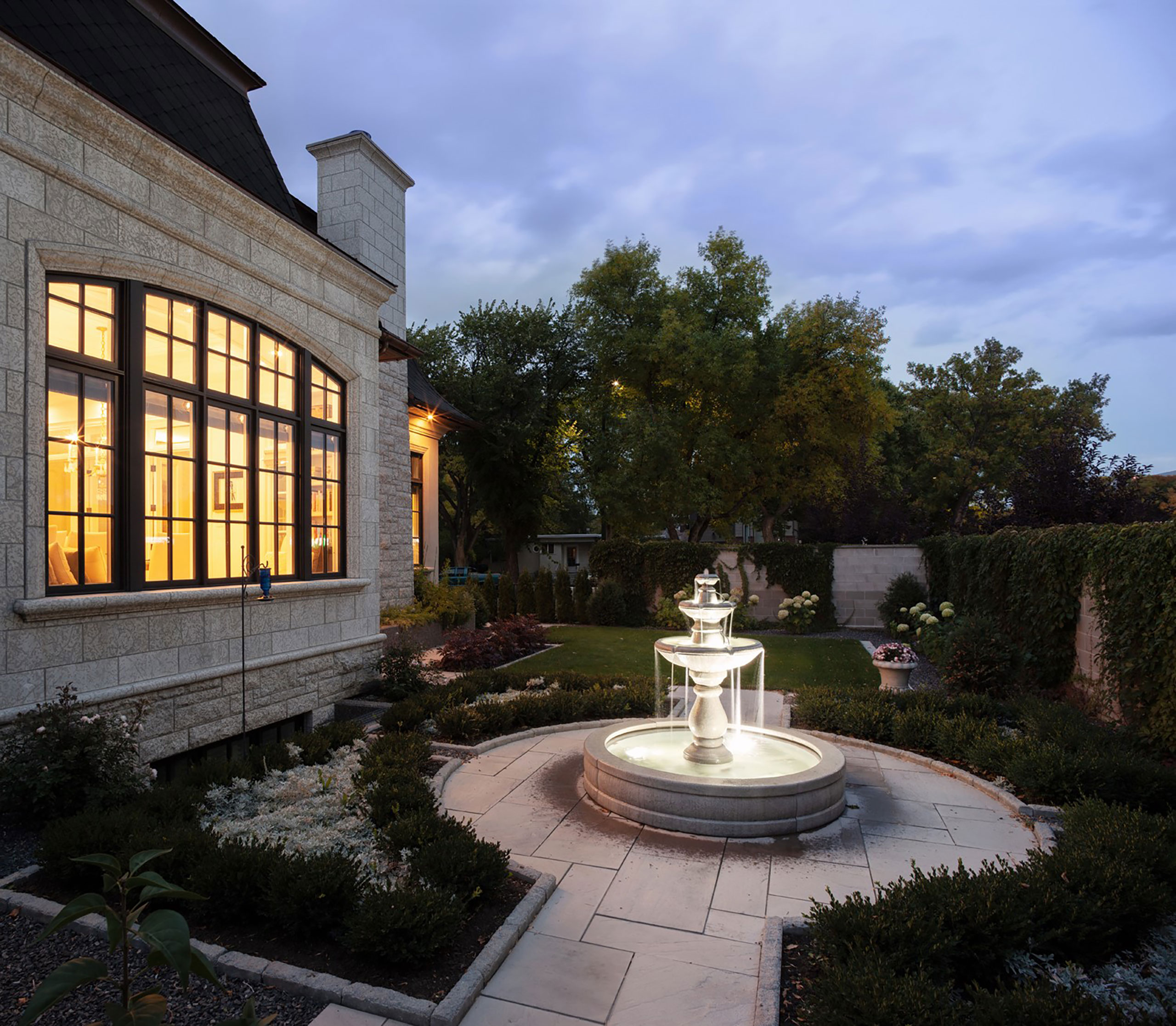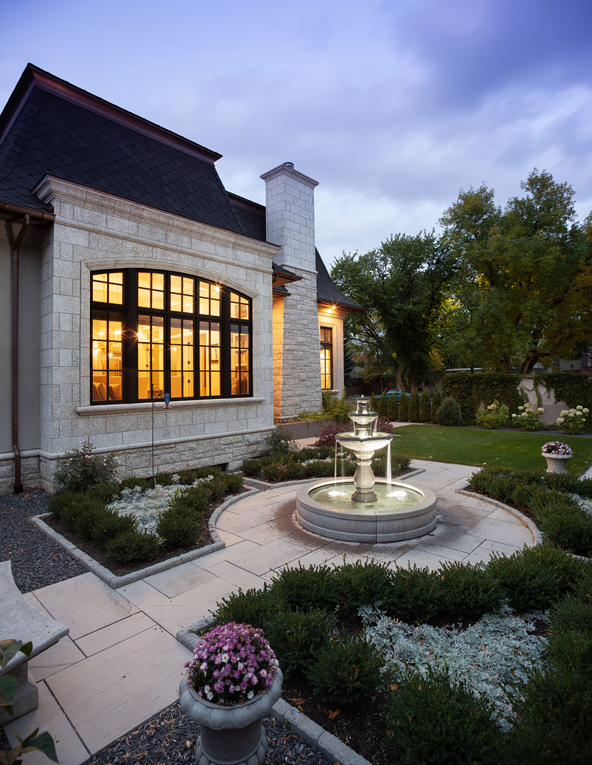 This inner city Lethbridge home, inspired by the homeowners travels, represents the timeless architecture of Europe. It is an invention of a classic French Provincial with all the elements and charm set in an urban surrounding. The Gillis Quarries full bed grey Tyndall stone was used in a rock face sawn ashler pattern, a sawn honed coursed pattern, custom sawn and honed arches, jambs and window sills, custom sawn bands, soffit, roof and chimney cornices. The front entry staircase is flanked by split face stone pony walls with custom cut, honed bull nose capping.