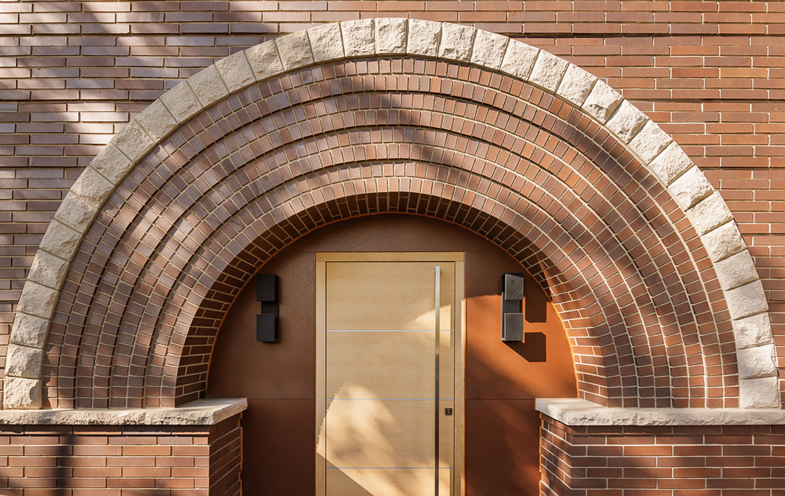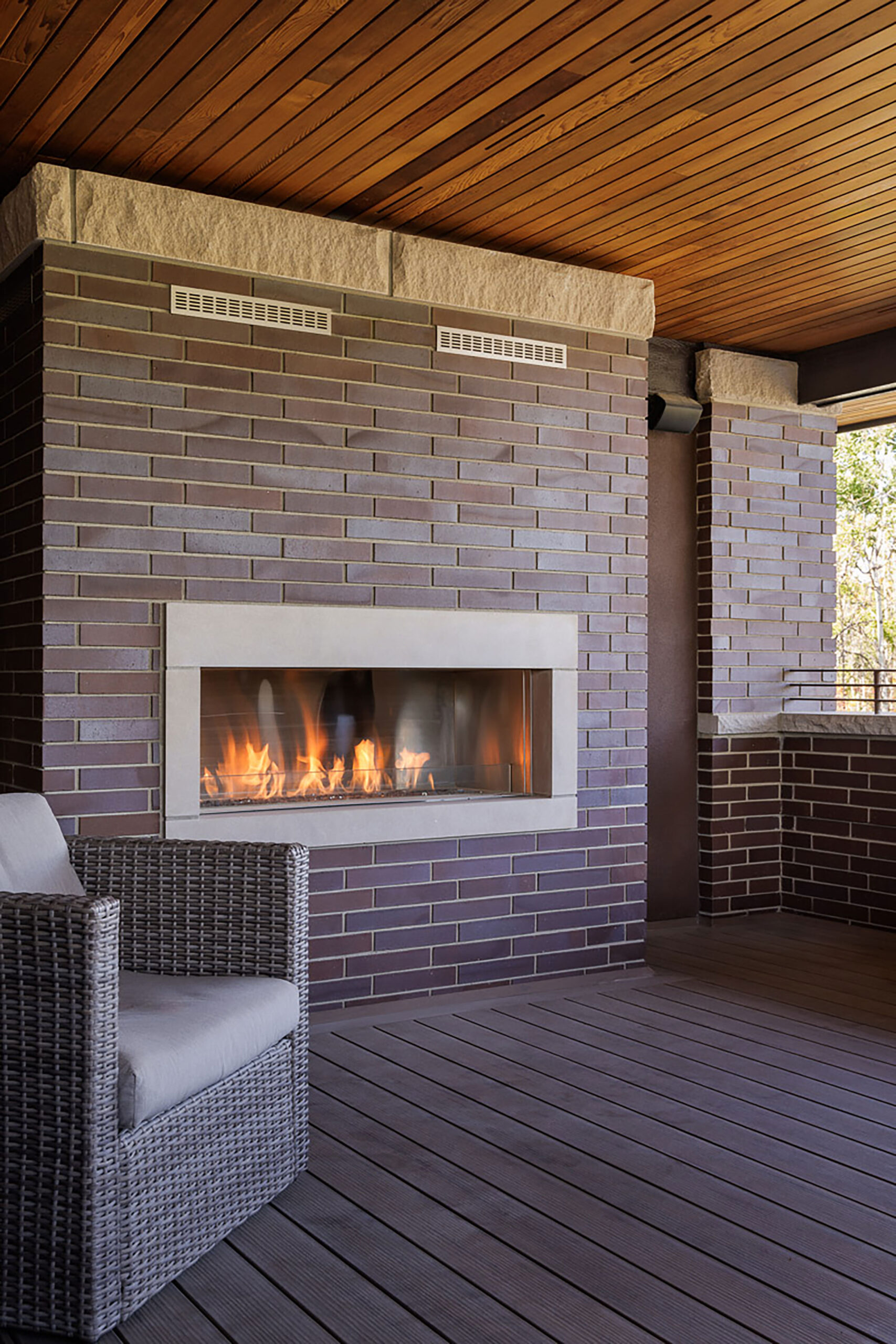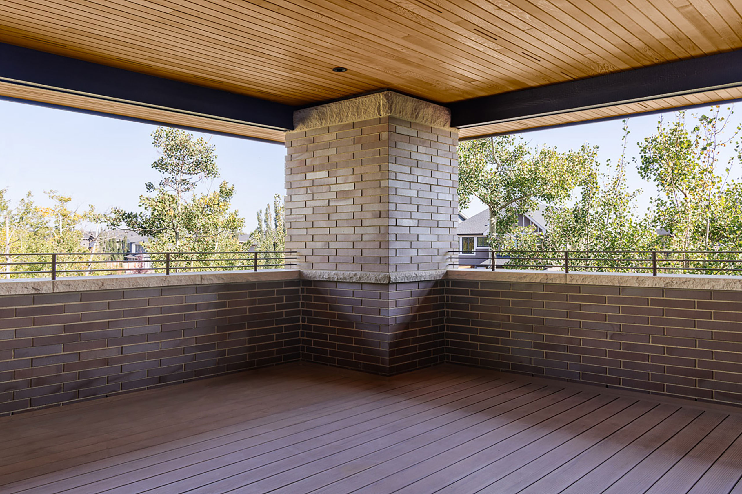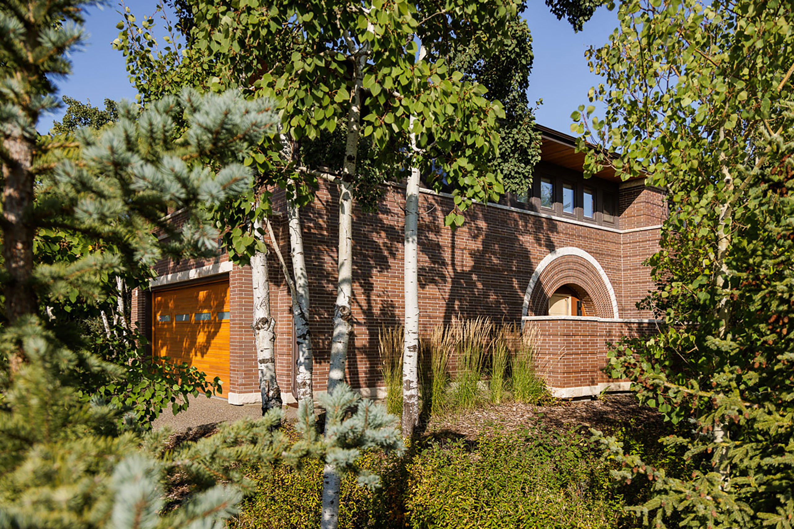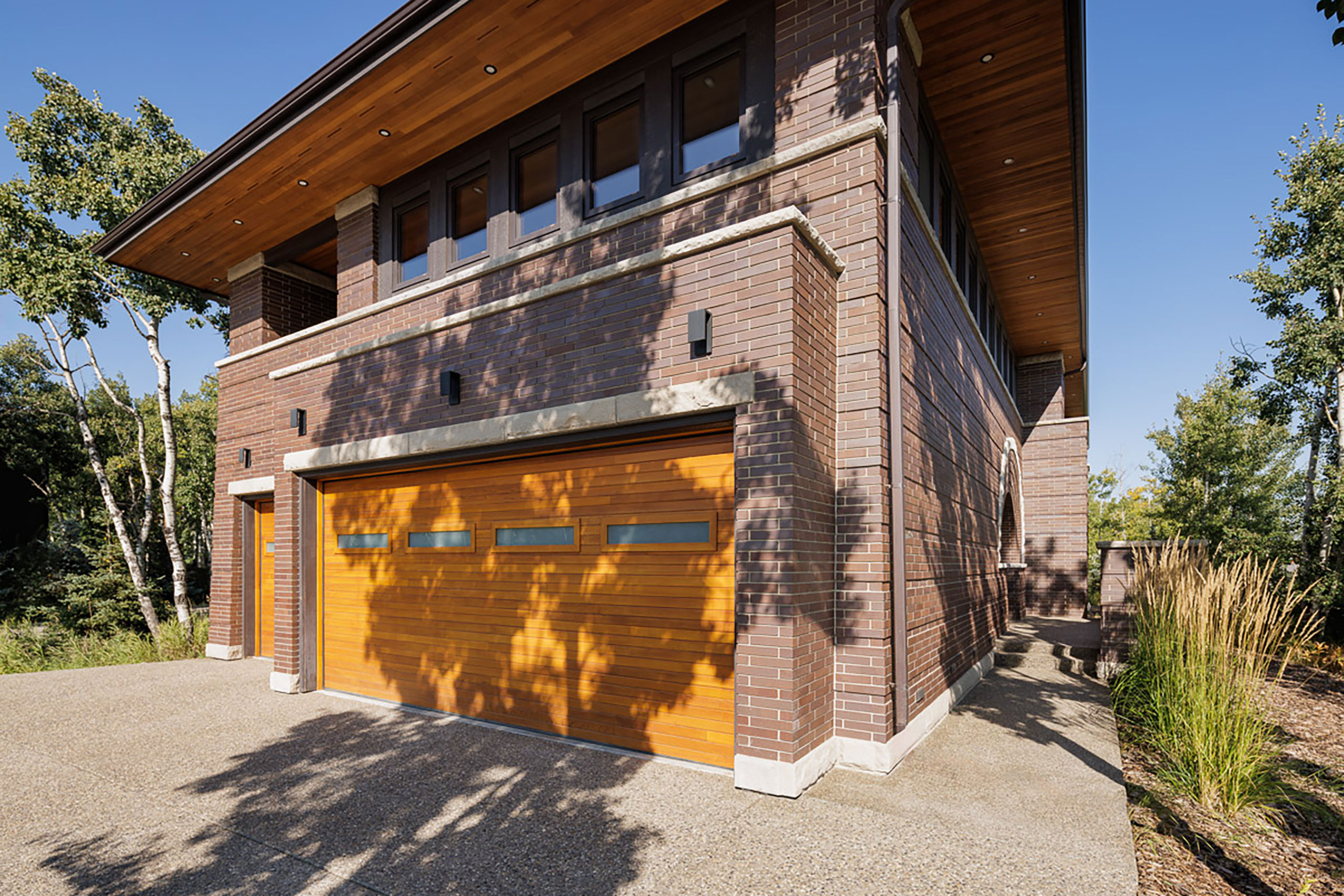 Design on this home was based on Frank Lloyd Wrights Prairie style. Specifically the Arthur Heurtley house in Chicago’s Oak Park. The house is a complete brick wrap with a stone plinth base. The brick work is a combination of plumb and sloped walls with battered coursing . All brick walls are capped with coping stones that are coursed out with stone banding and sills. Stone was also used as the last ring of a 9 ring corbelled barrel arch. Additional stone details include banding, sills, headers, fireplace surrounds and freeze stone details.