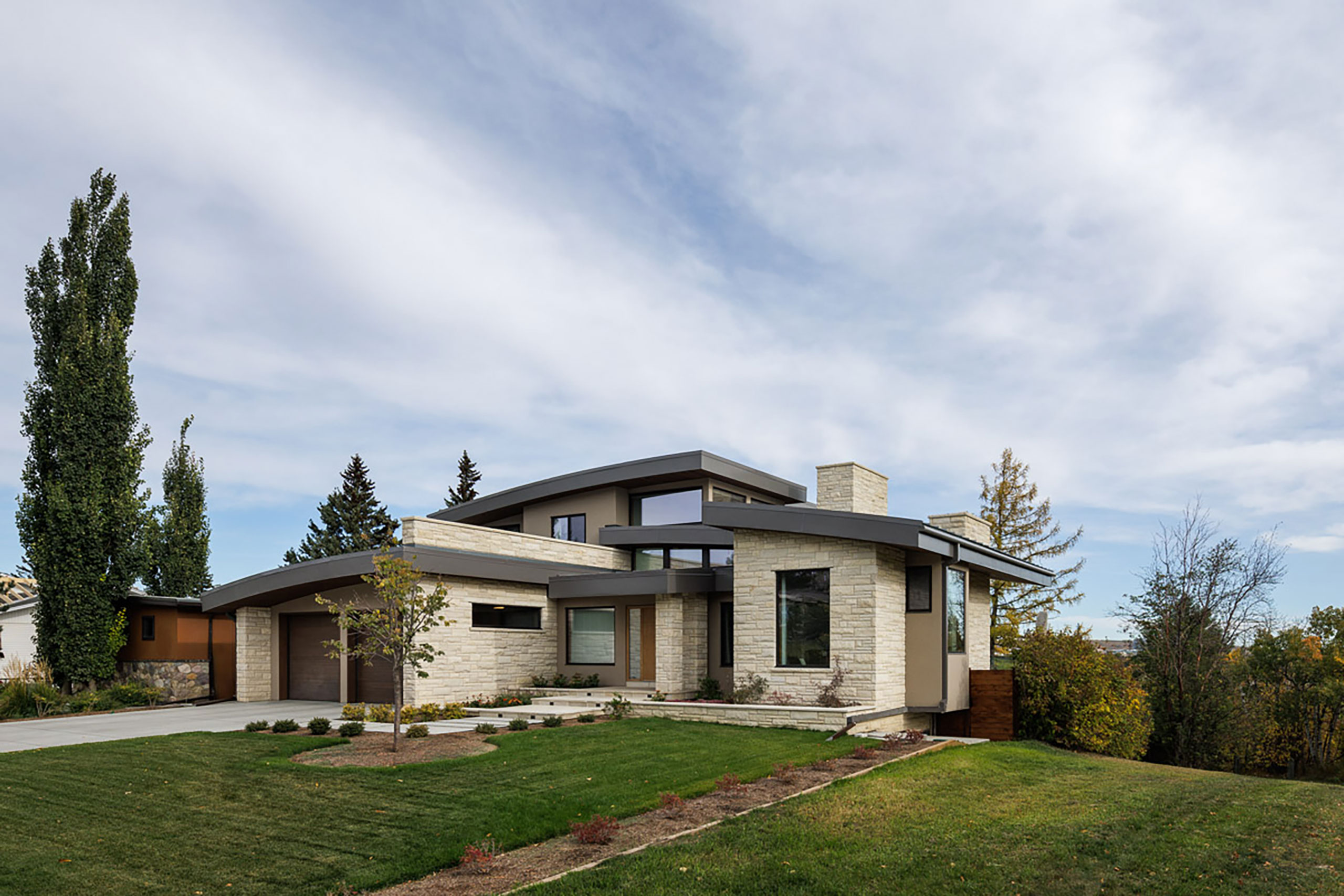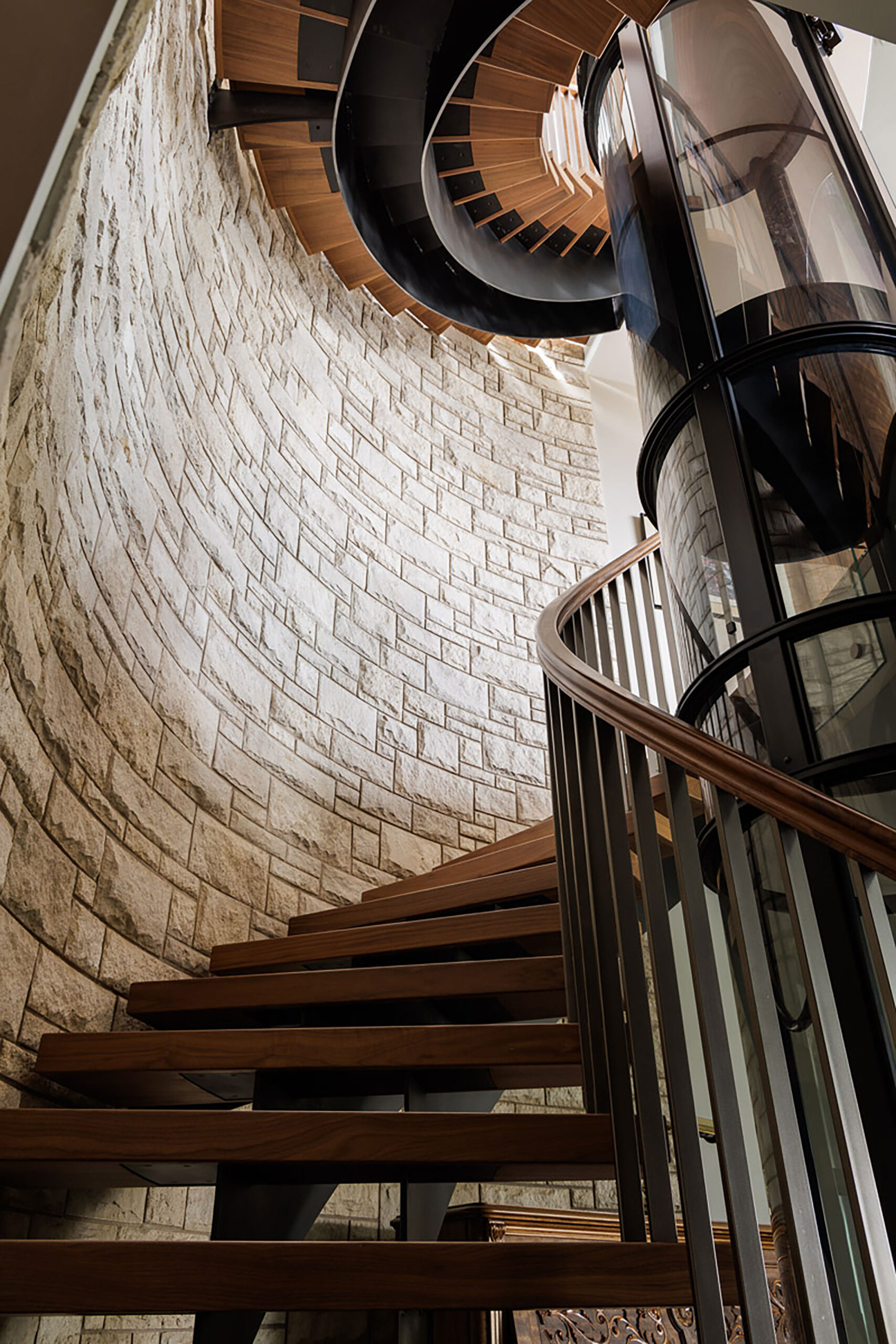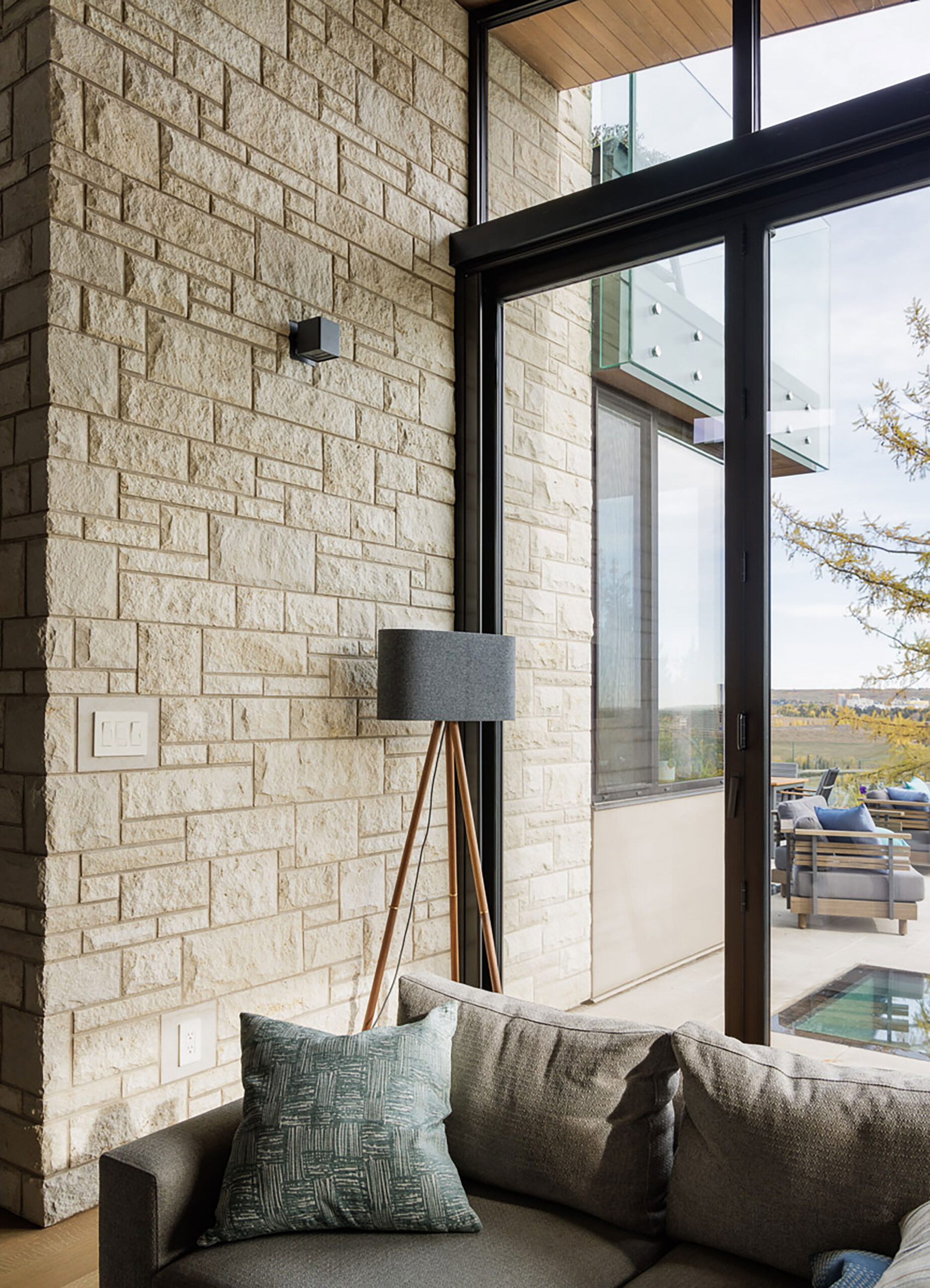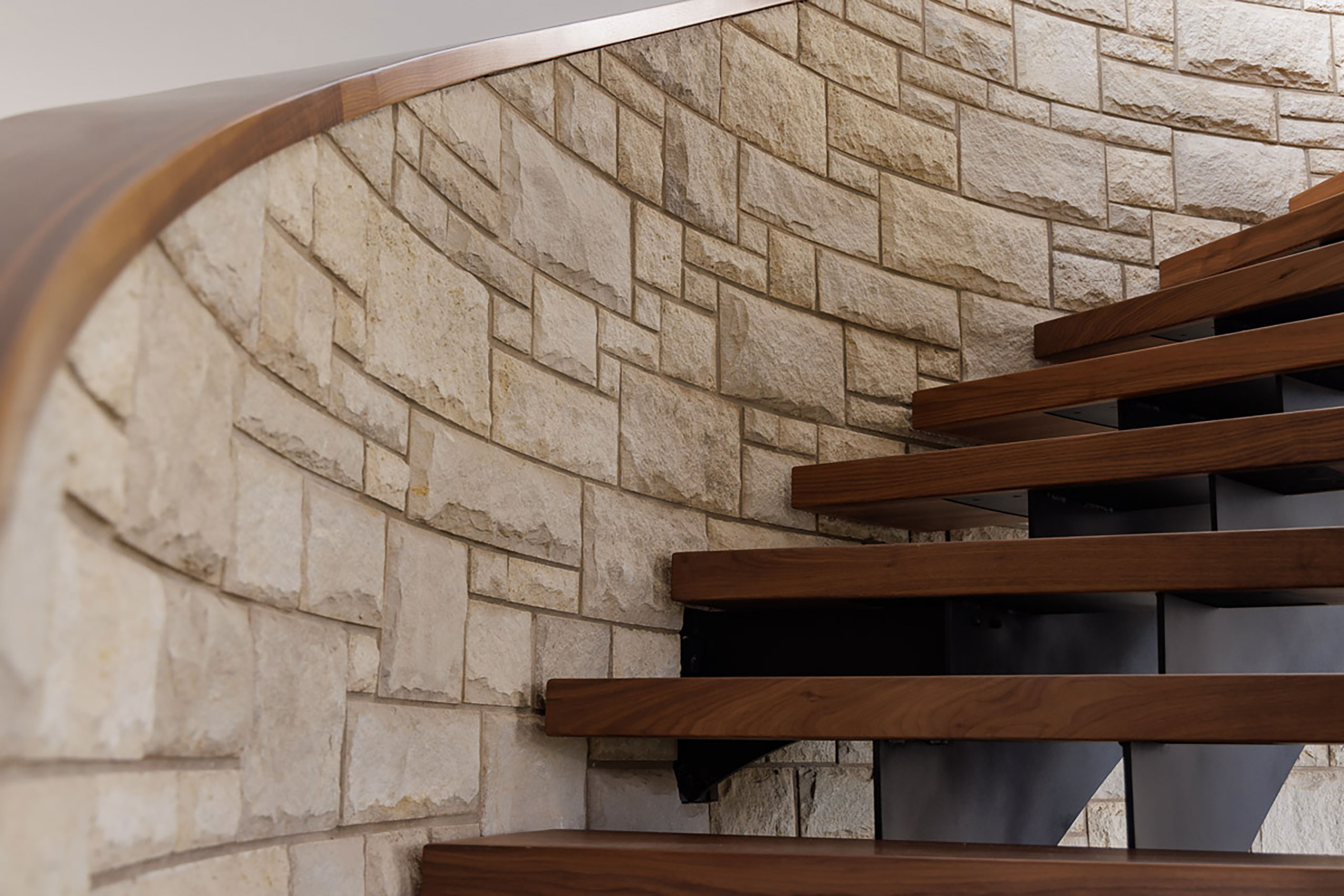 The masonry was incorporated in this contemporary home with both modern exterior lines and traditional elements. The full bed stone on the exterior flows seamlessly into the interior through commercial windows and door jambs. There are many feature walls throughout the interior on all three levels as well as two masonry faced fireplaces. The main interior feature is a French radius staircase with the stone spanning all three stories. The exterior included custom cut Ashler pavers over concrete on the patios, decks and stairs. The masonry products utilized included US Stone Industries Cottonwood limestone full bed stone and thin veneers all sawn and hand carved.