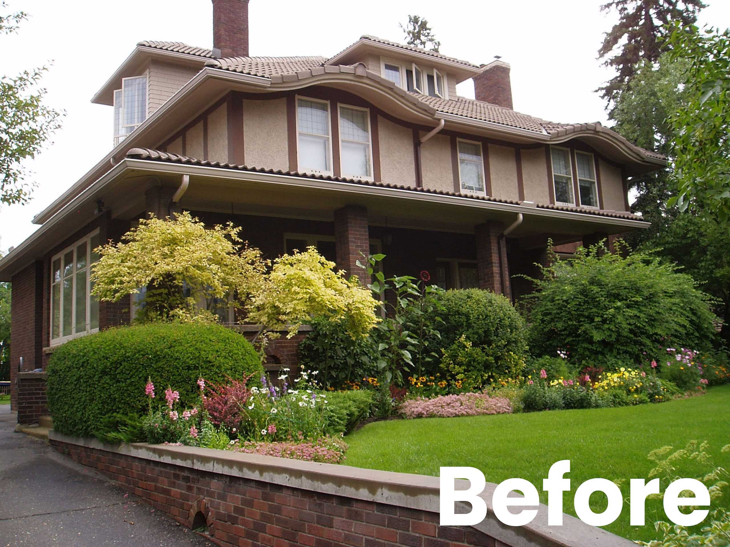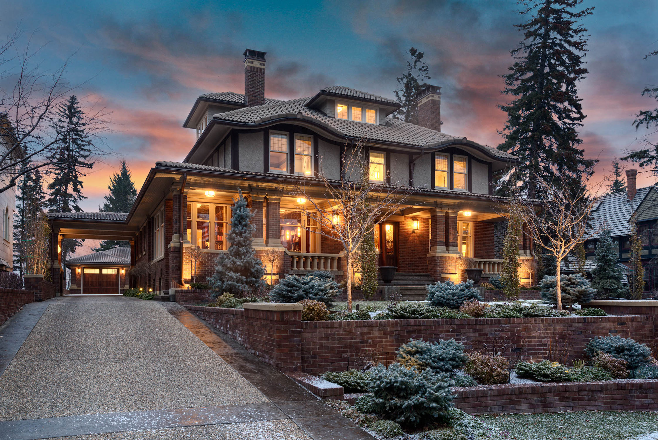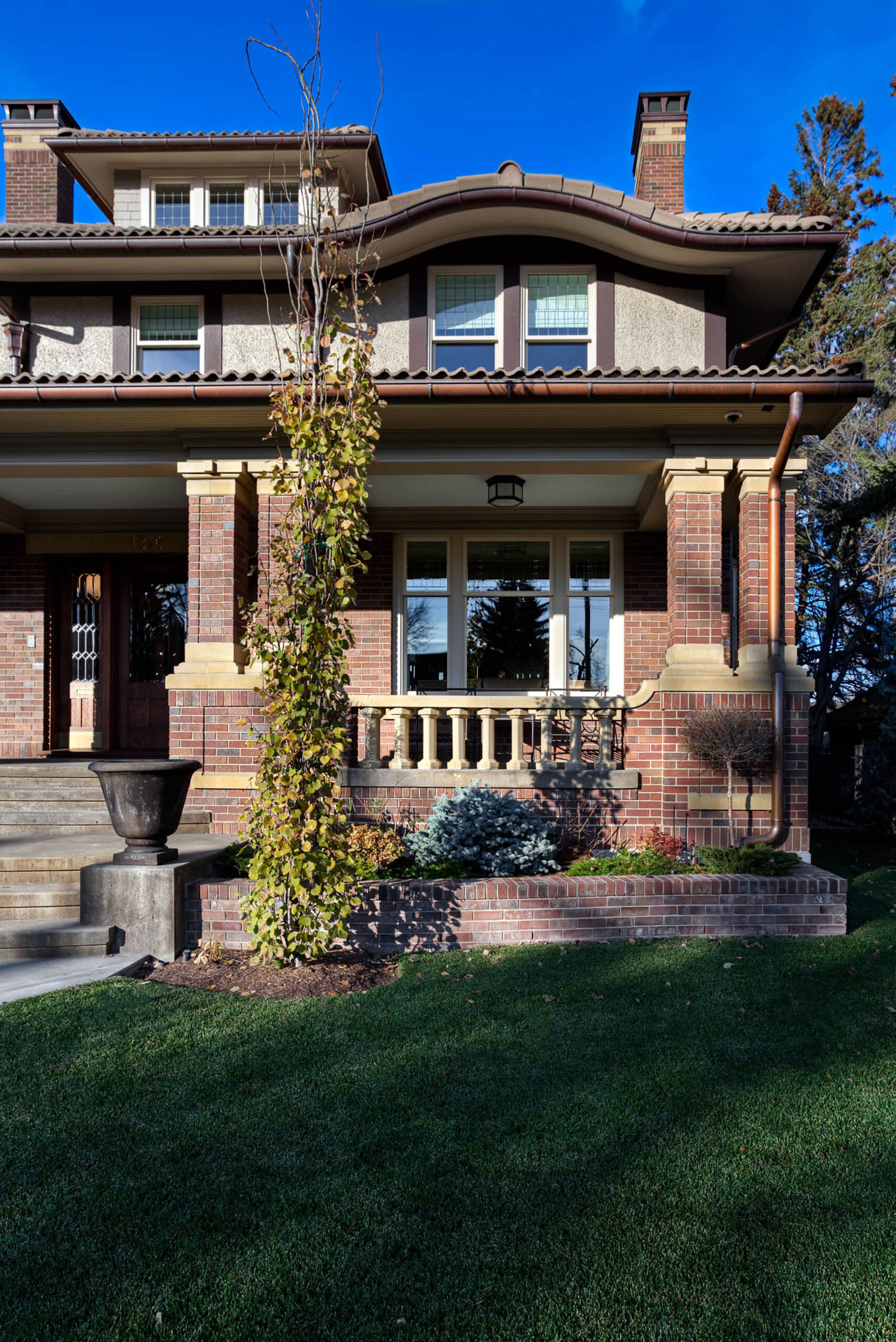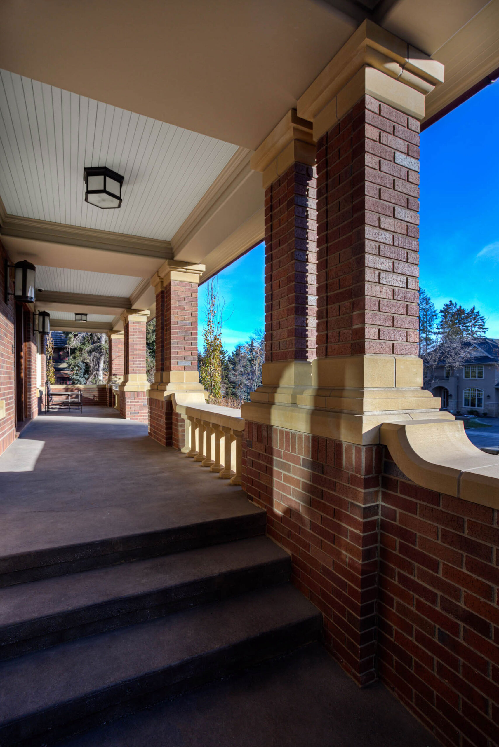 Due to deterioration, the only original brick is on the east exterior wall. The restoration/renovation involved skillfully blending four bricks, extending the front porch, adding new front yard landscaping, as well as a new rear yard garage. The front facade, driveway side, and rear brick walls were all redesigned in the original character to accommodate a modern floor plan. The porch columns were doubled, sandstone bases and capitals were added as the former columns lacked both base and capital detailing. New sandstone balustrades, coping along with new windowsills (too deteriorated to repair) finish the front porch. All new sandstone is hand cut from Spanish Sandstone as it closely resembles the original Paskapoo Sandstone. The landscaping involves two stepped brick retaining walls with rowlock capping and sandstone caps adjacent the stairs. The chimneys were re-pointed and capped with sandstone and copper shrouds to hide the new metal exhausts. A new brick and sandstone exterior fireplace extend the shoulder seasons while integrating into the home’s historic aesthetic.