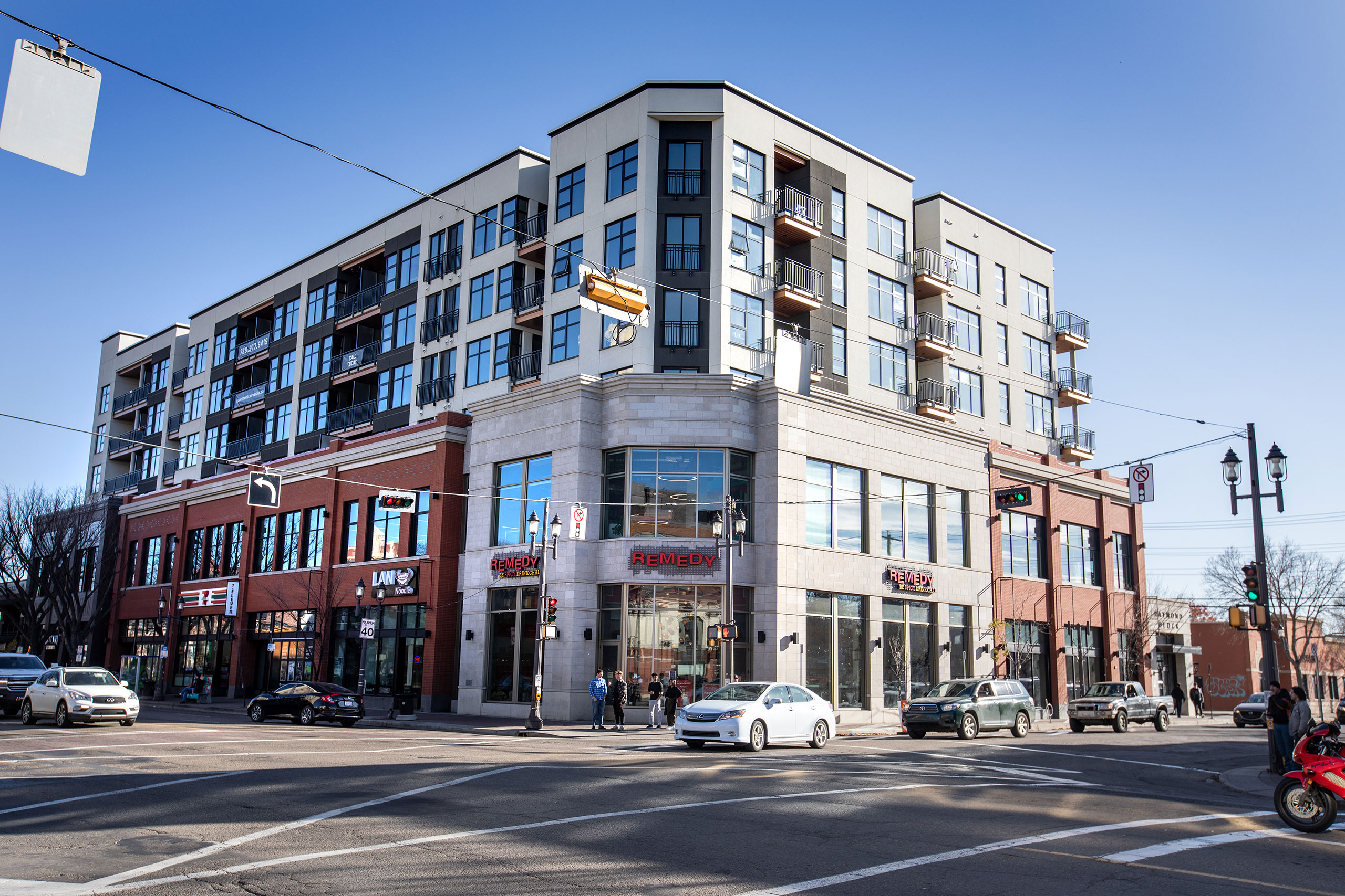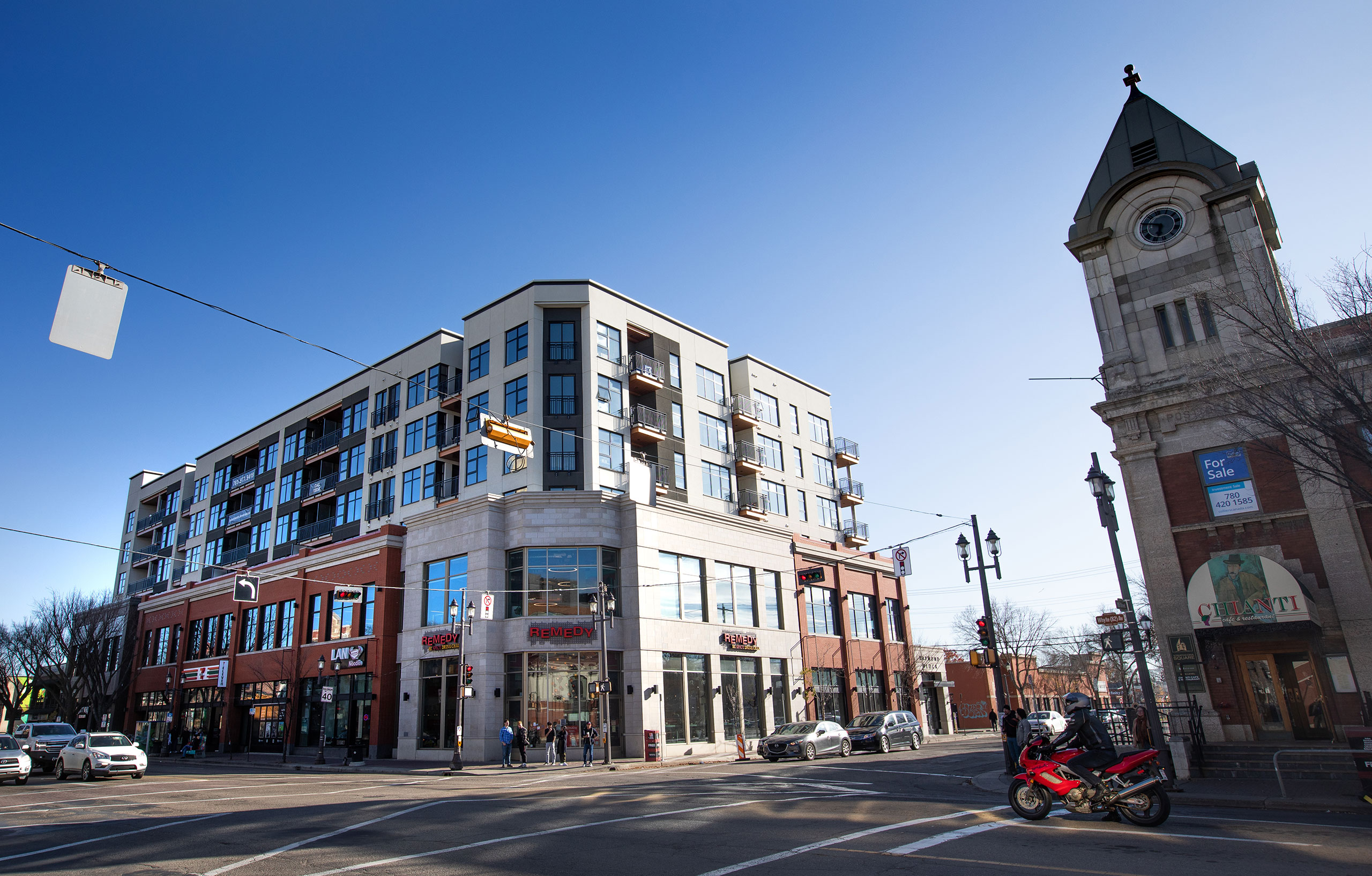 This project was a new build located on the Southeast Corner of 105st and Whyte Avenue. It consists of 1 Level of underground parking and 6 floors above grade, plus a mechanical penthouse level. The main floor is comprised of CRU’s, 2nd floor is for office spaces and levels 3 to 6 are residential suites. The North and West elevations which are most visible have a combination of granite and precast to the base of the building with brick veneer above to the 2nd floor parapet. The Northwest corner of the building and Southwest residential lobby access are fully clad with Indiana Limestone.