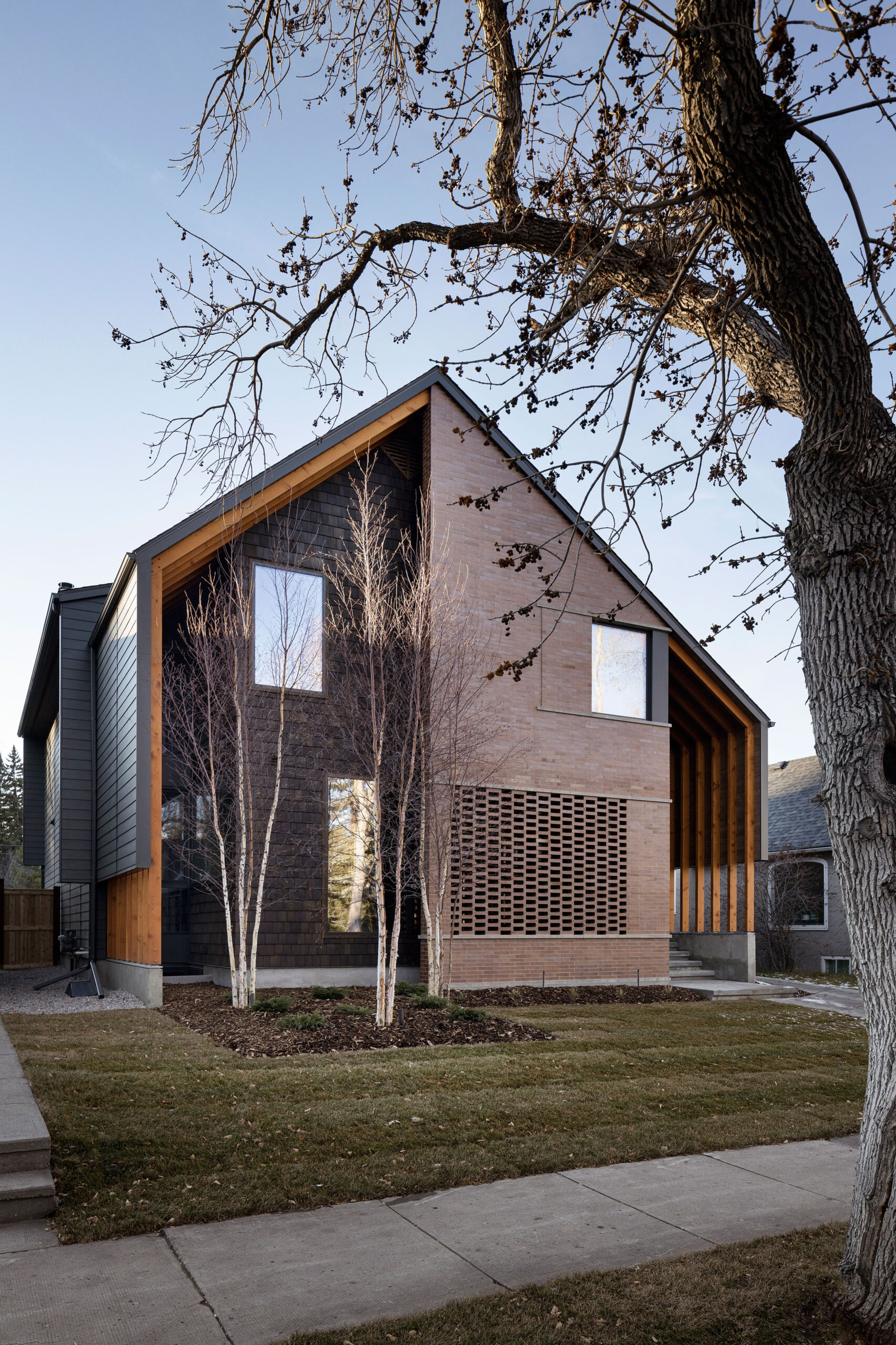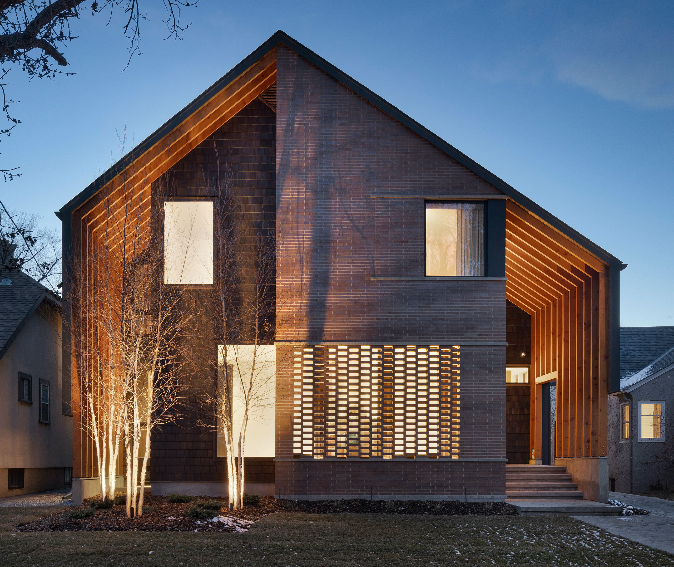 Brick and stone masonry, Yankee Hill Medium Iron Sport Brick and Limestone, help define a Nordic contemporary aesthetic. With the use of masonry, cedar, timber, and concrete, the front facade uses asymmetry and alignment to create a dynamic façade.
