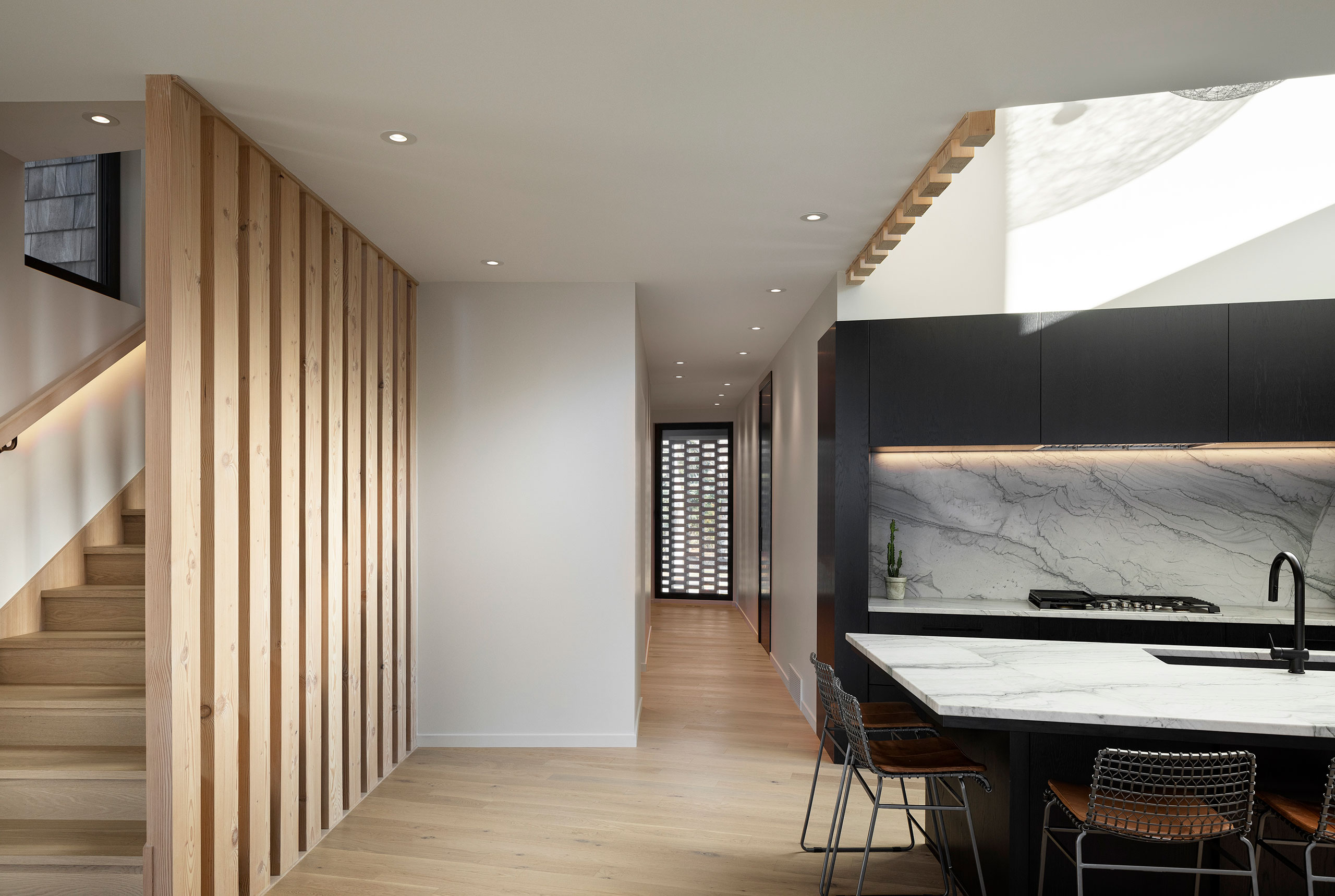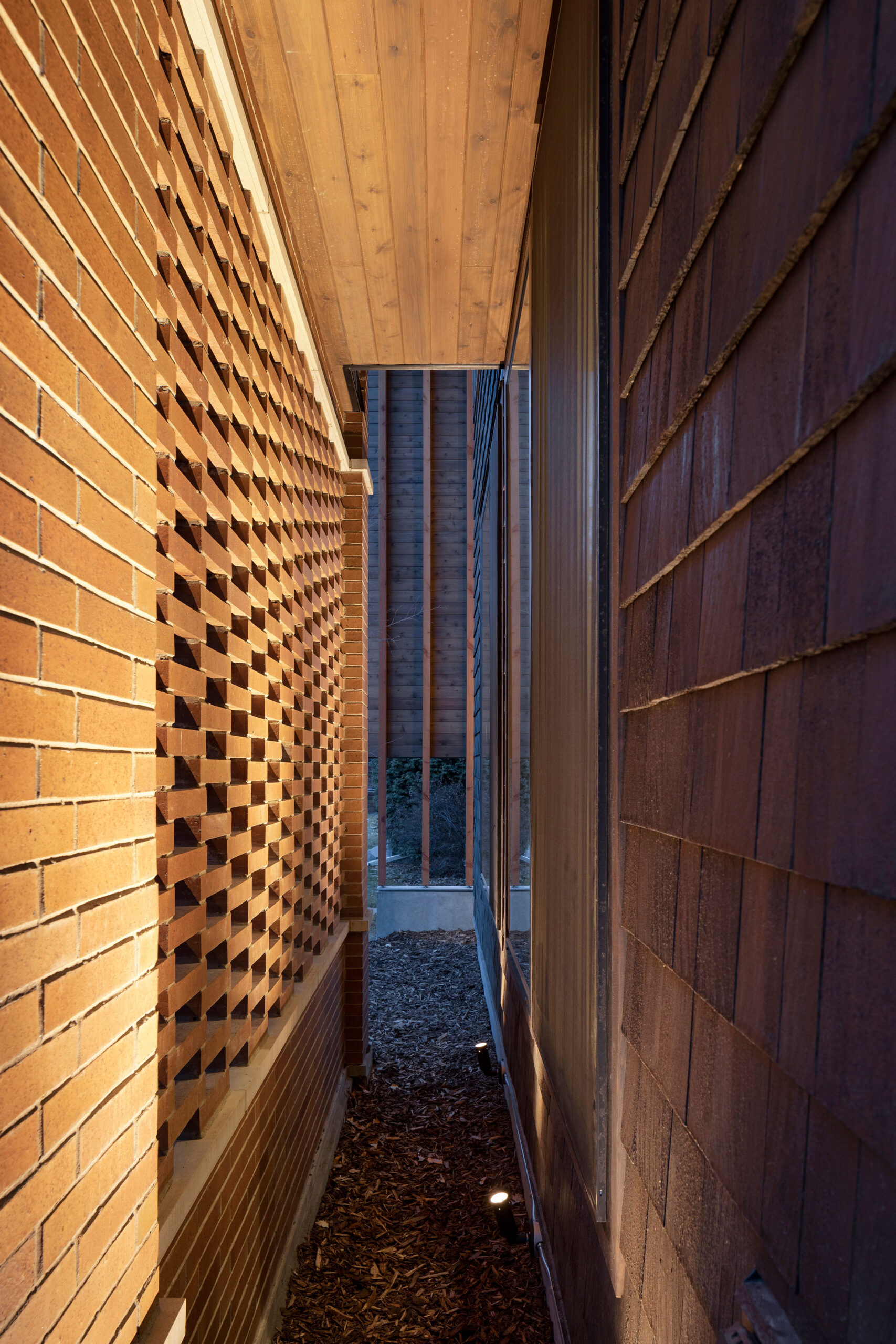 Brick was utilized to anchor the home front and back. The ‘hit and miss’ wall creates interest at the front façade but more importantly helps mitigate the views into the home, which is always a challenge, while simultaneously allowing light to pass freely into the home. For the interior there is a similar effect as it gives interior vistas something to end on while still allowing the home occupants a connection to the exterior.