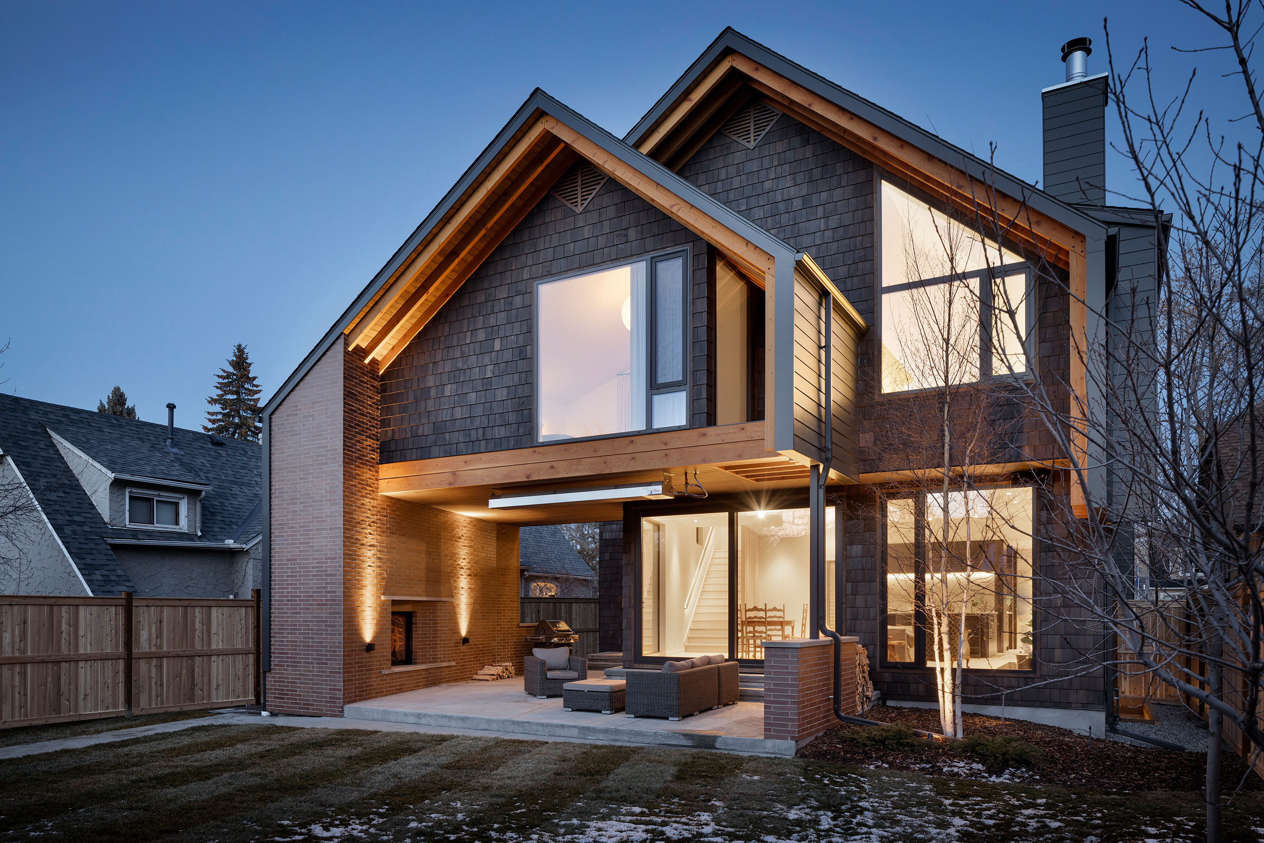 The location of the brick fireplace at the rear of the home helps define an exterior sitting area and creates privacy. It also allows our spatial separation calculations to increase the size of windows facing the side property line allowing more light into the home.
