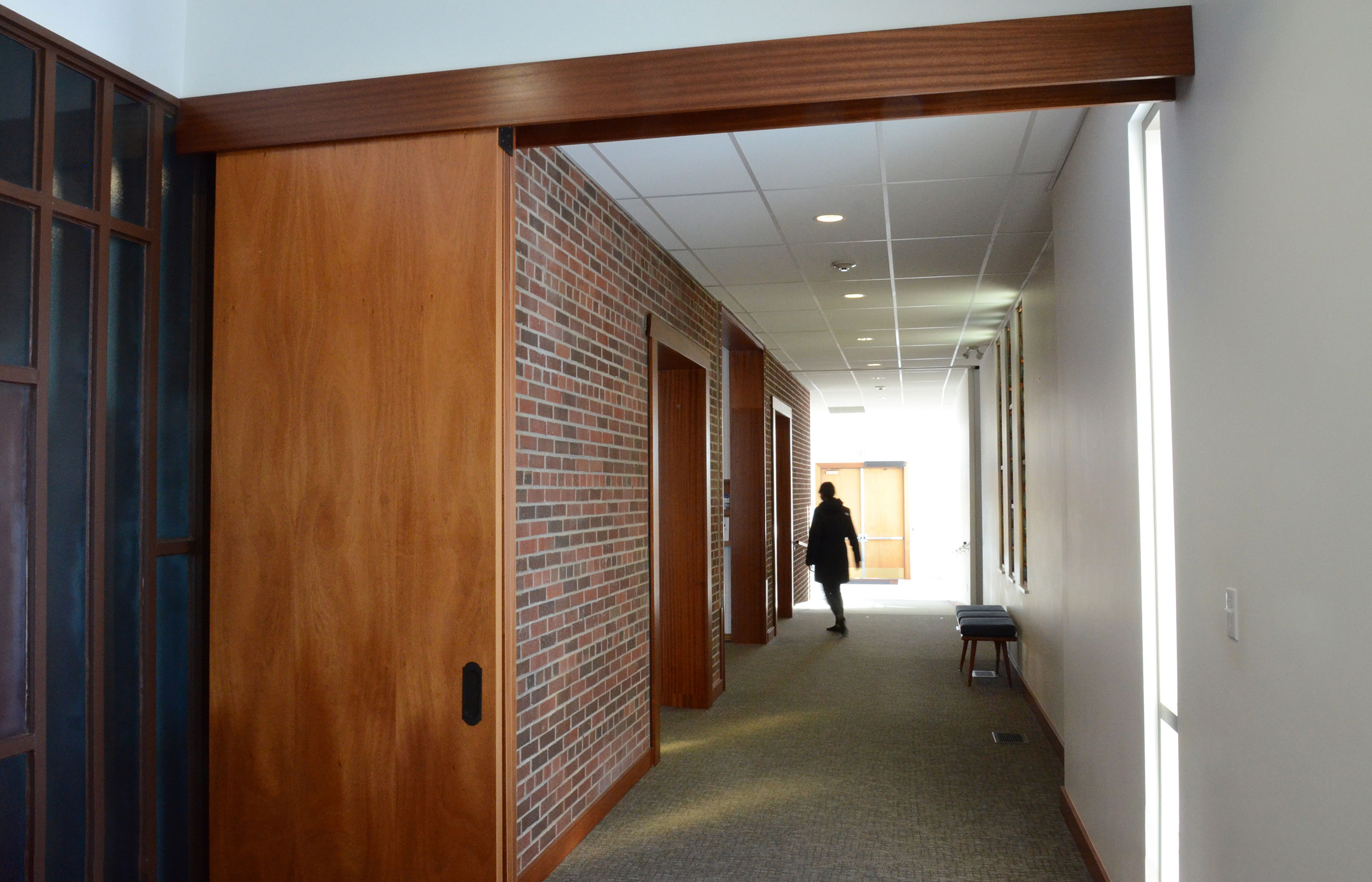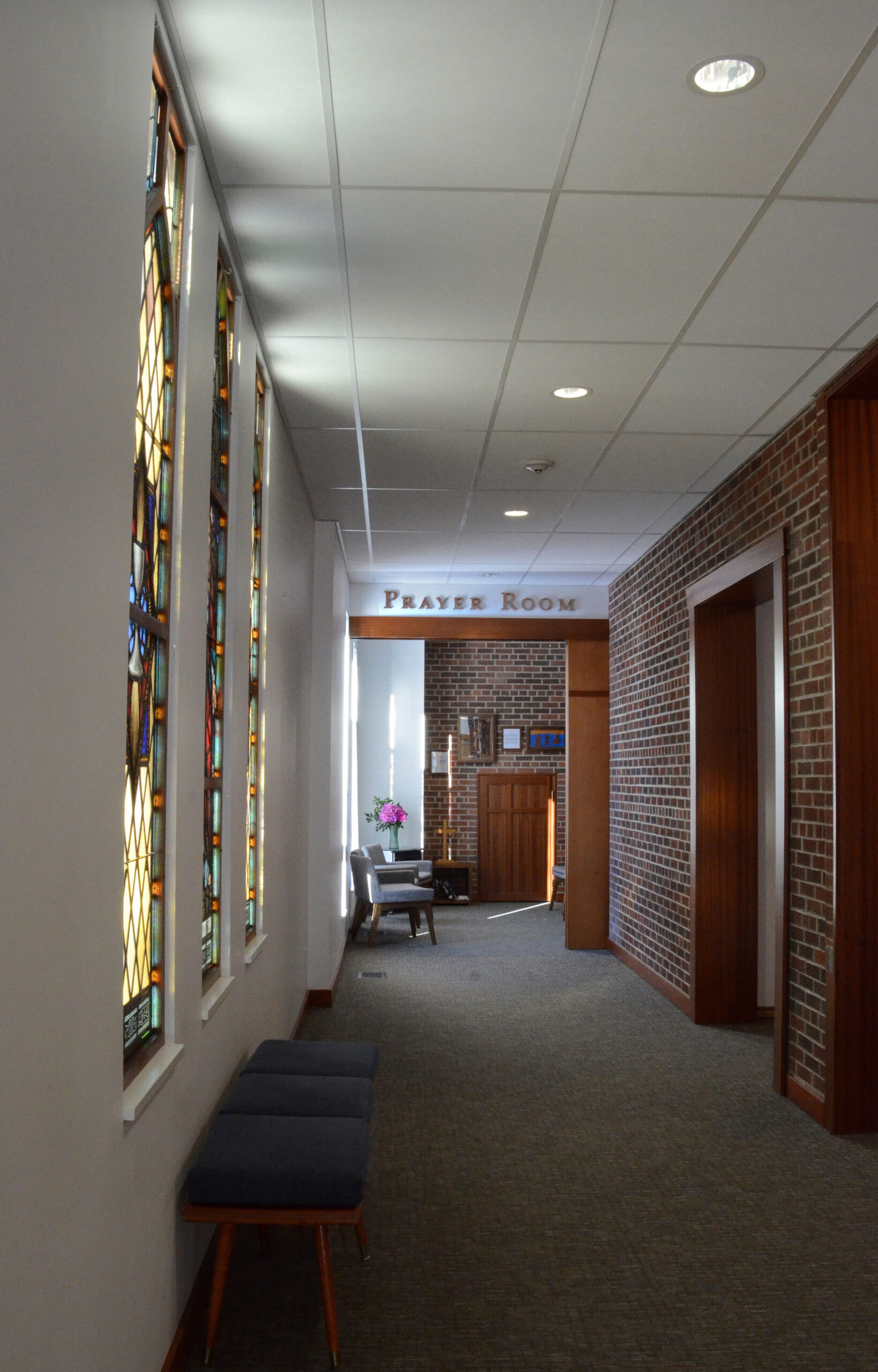 Church users now encounter the original brick façade inside the building. The addition also uses the brick wall of the bell tower as a devotional wall in the prayer room.