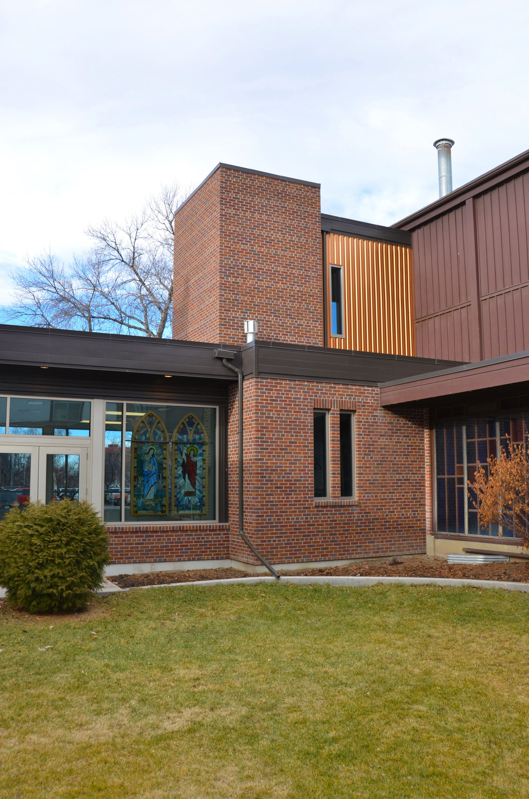 Copper-coloured metal siding creates a dialogue between old and new, extending past the 1950s building to connect an education wing and beloved courtyard to the main church.