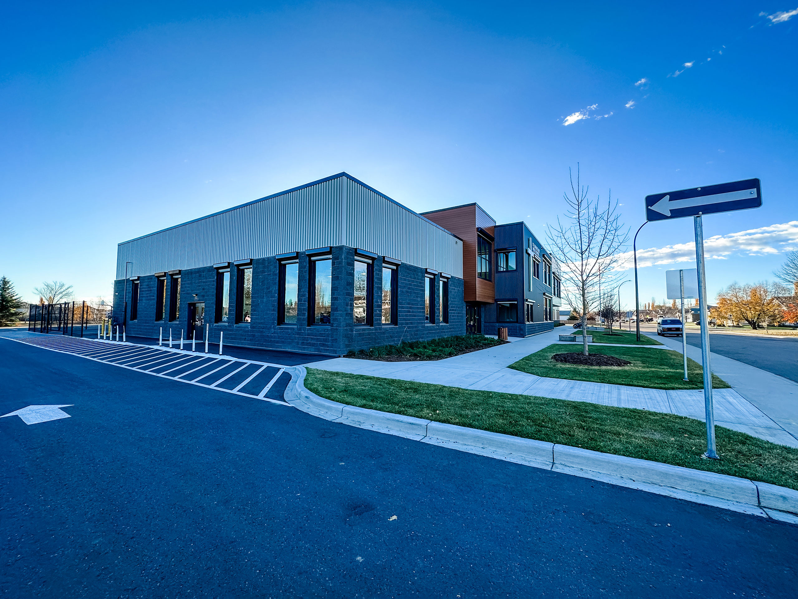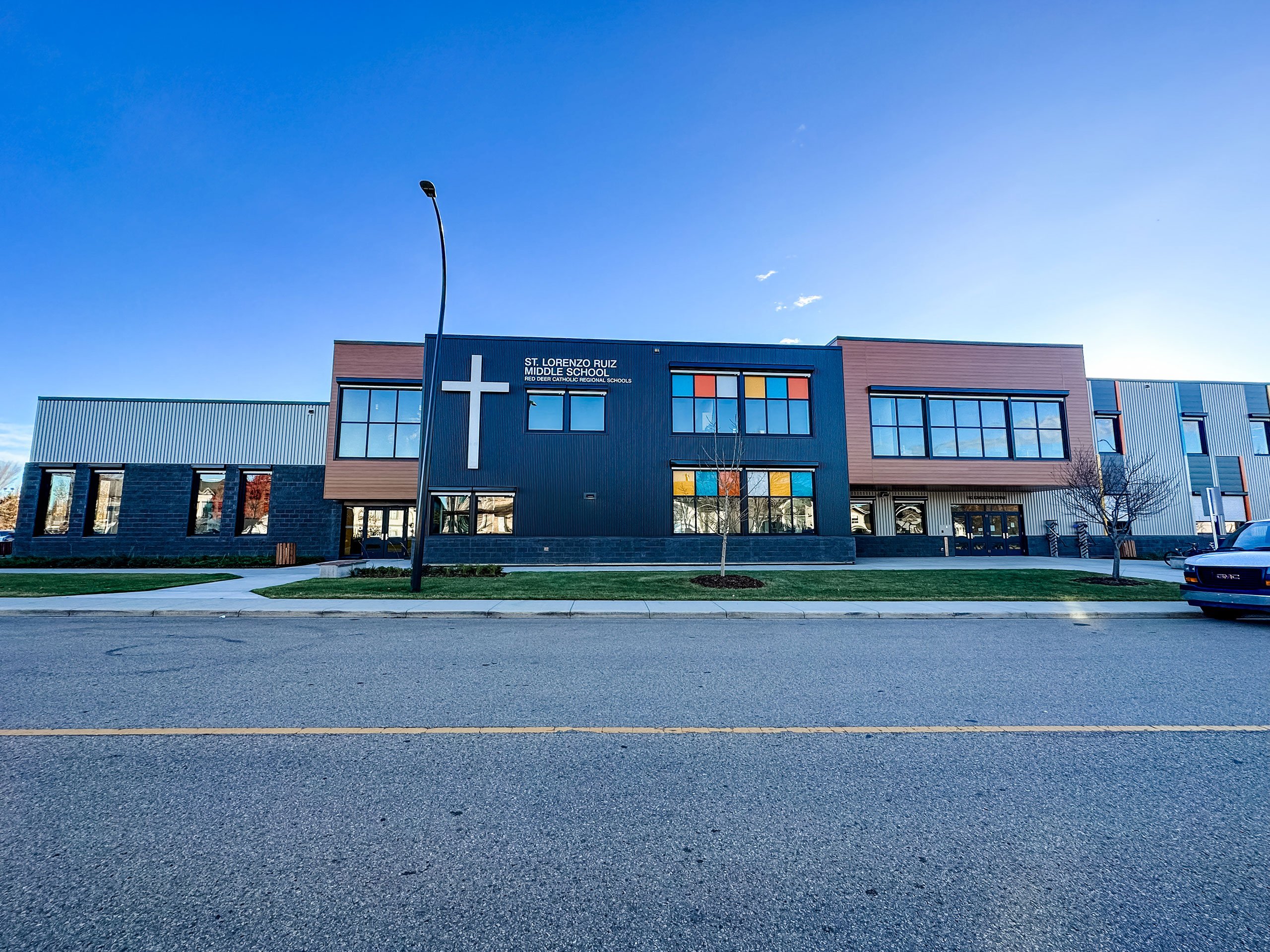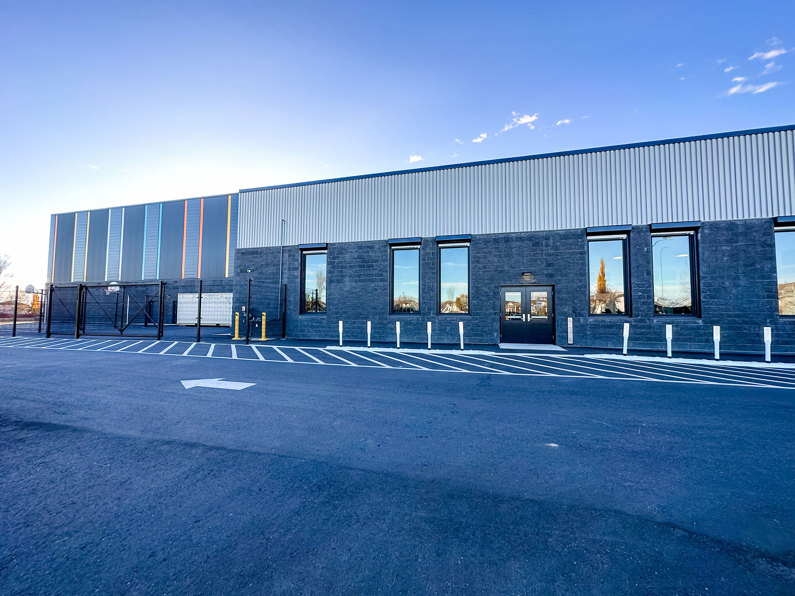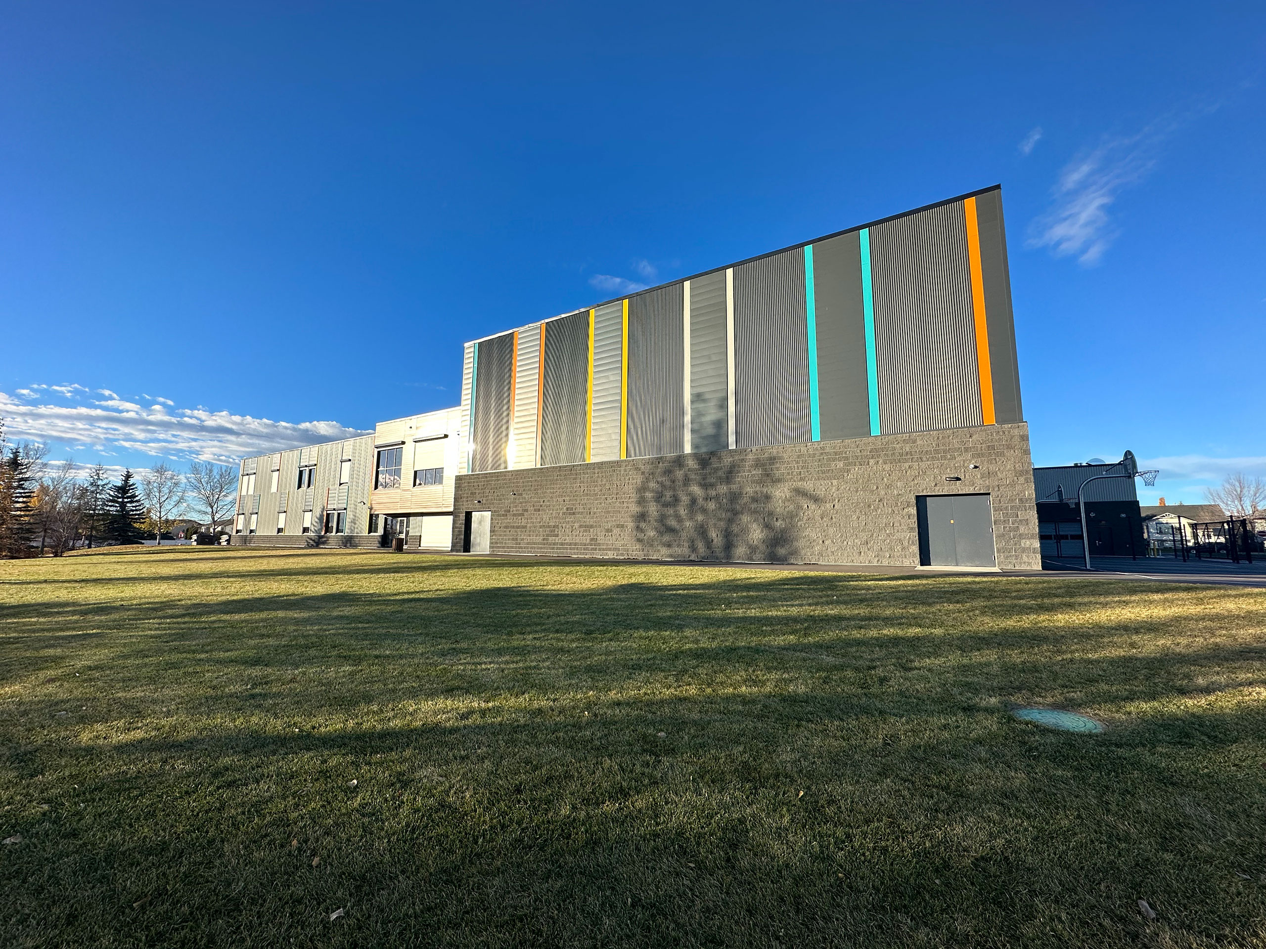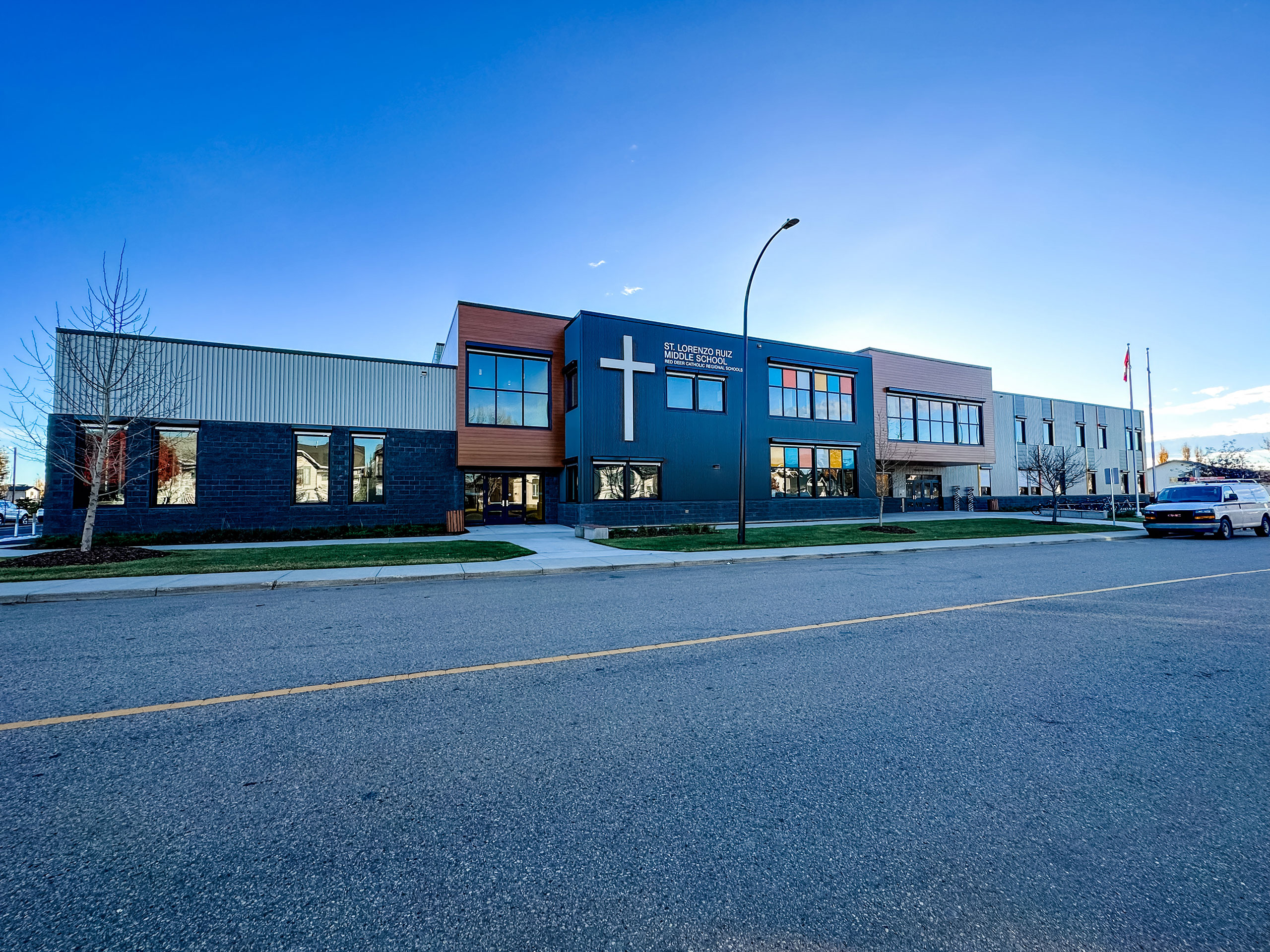 The St. Lorenzo Ruiz Middle School project was a new large two story school located in Red Deer. The project included 10cm, 15cm and 20cm concrete block walls throughout the the corridors and classroom areas. The large load bearing gymnasium was made with 30cm concrete block. There were three load bearing 20cm concrete block stairwells and one elevator shaft included in this project. The exterior of the school consisted of a combination of charcoal split face block veneer and charcoal split ledge block veneer.