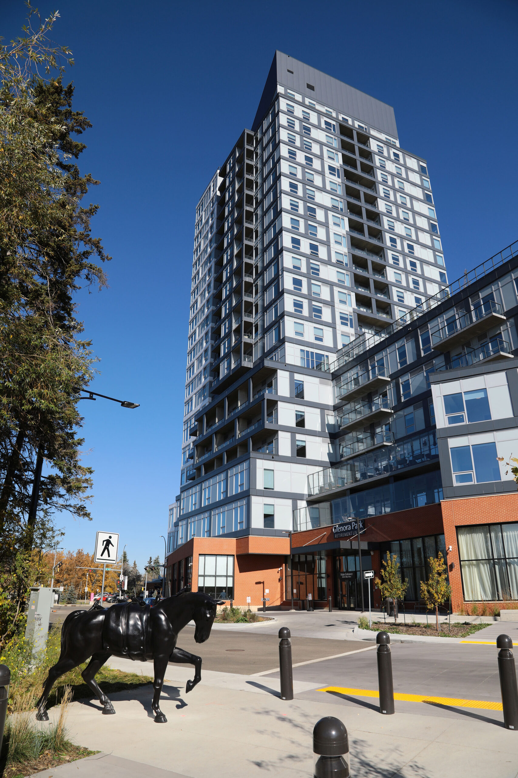 This project is a new build residential living tower with three levels of underground parking and twenty-four floors of tower, with the upper two levels comprised of an amenity space and mechanical space. The masonry scope involved concrete masonry unit walls to all levels of the parkade and tower, including a concrete masonry unit separation wall for the full height of the stairs to the upper top floor level, limestone panels to the base of the building, and the full perimeter with brick veneer above for the first floor level.