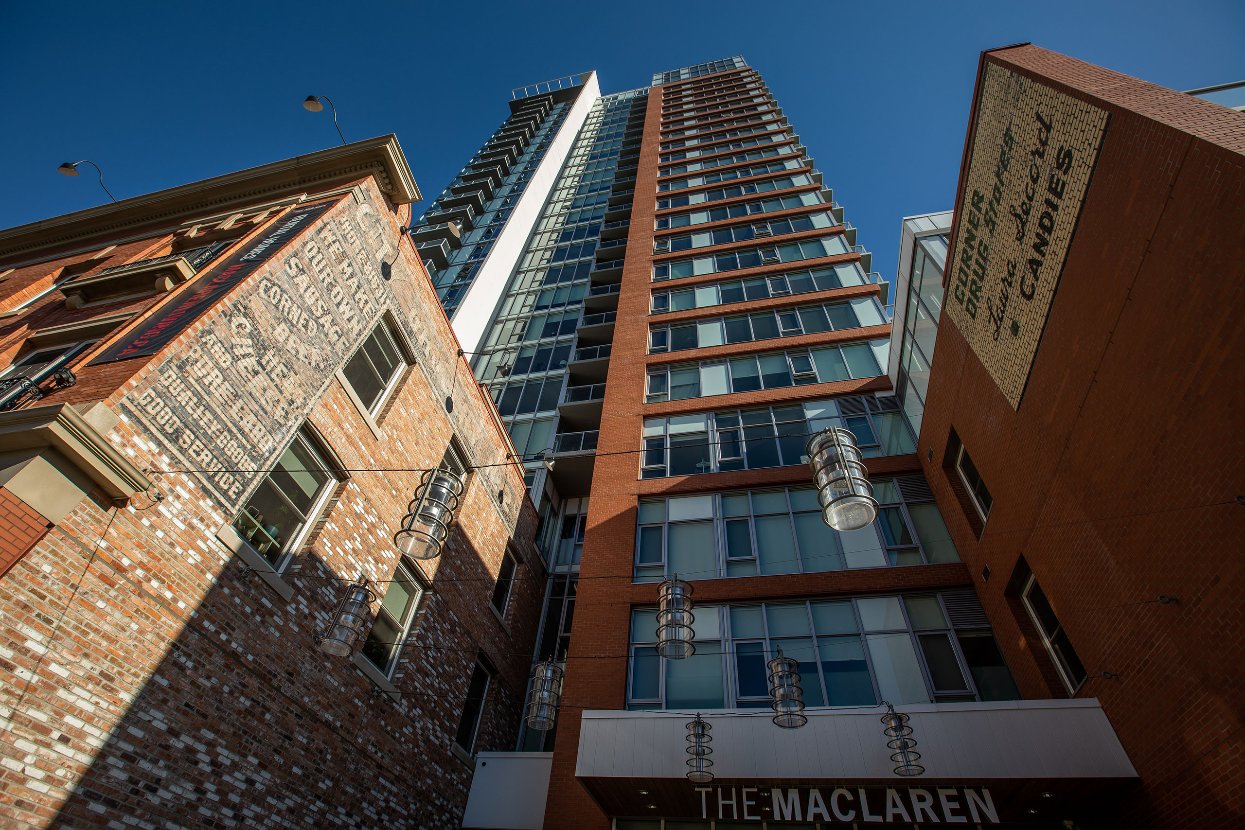 This project initially involved the demolition and salvage of the brick veneer and limestone elements façade from the original 3-storey MacLaren Building. Once demolished, a new 27-storey high rise residential tower was constructed with 4 levels of underground parking and commercial space to the main floor level. The project involved CMU work throughout and rebuilding the façade to the North & West elevations and North face of the residential tower access courtyard South face to match the original deconstructed building façade (façadism), which included incorporating the original ghost signs.