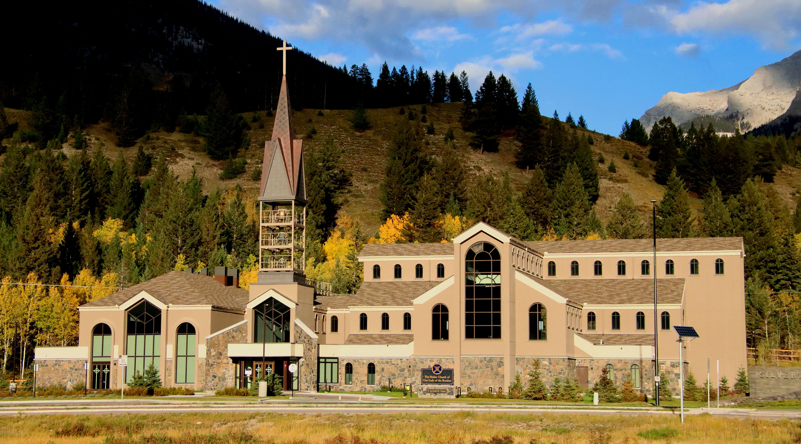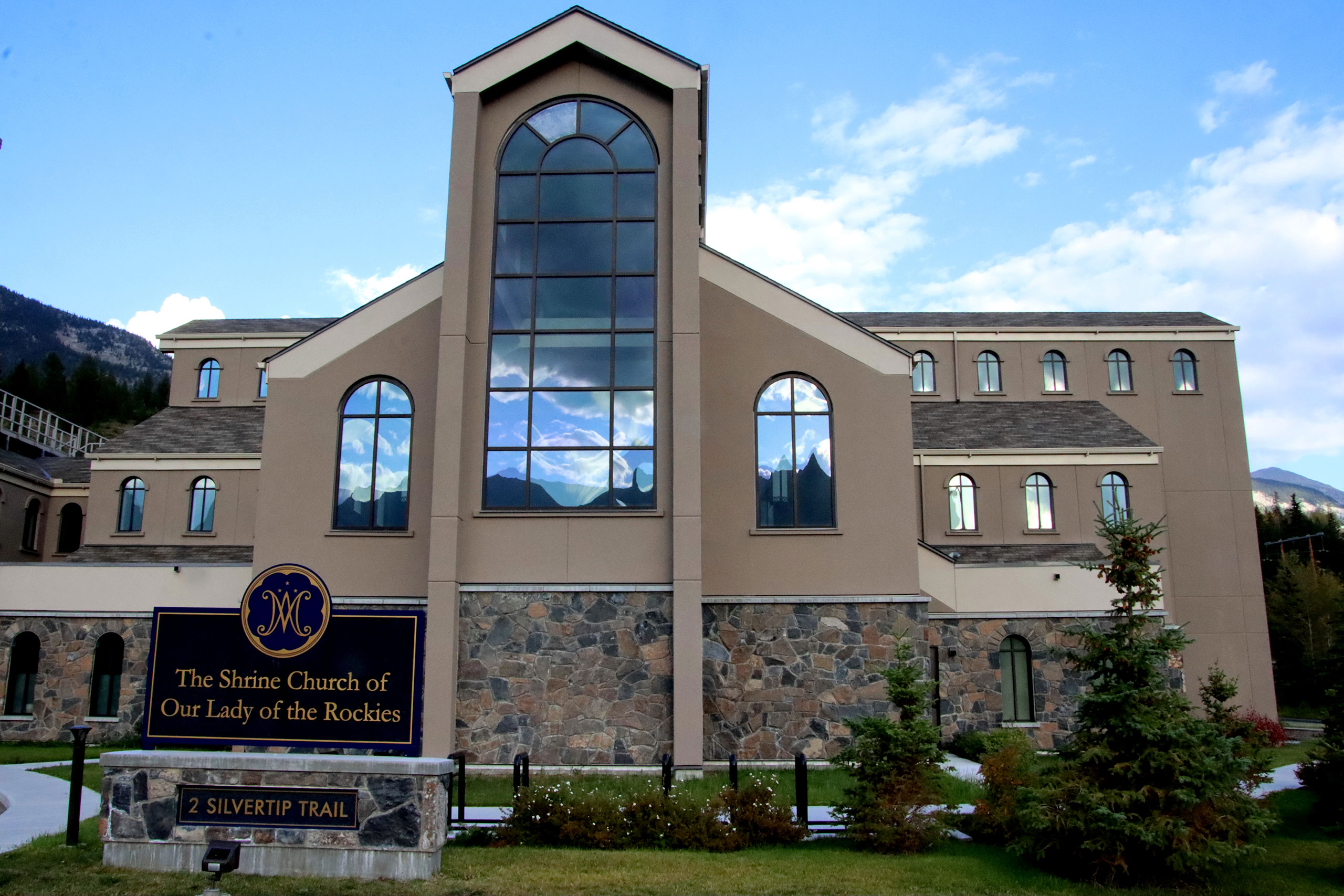 A shrine in the Catholic religion is a special place where people from all regions of the world may make a pilgrimage (spiritual journey) to connect with their faith. The Shrine Church of Our Lady of the Rockies is the latest such shrine to be constructed in Canada. On grassy meadows, with a backdrop of aspen and coniferous forests and resting at the base of Mt. Lady MacDonald, stands this magnificent religious architectural shrine. As the shrine comes into view in the Bow Valley, it invites and inspires a sense of awe and peace.