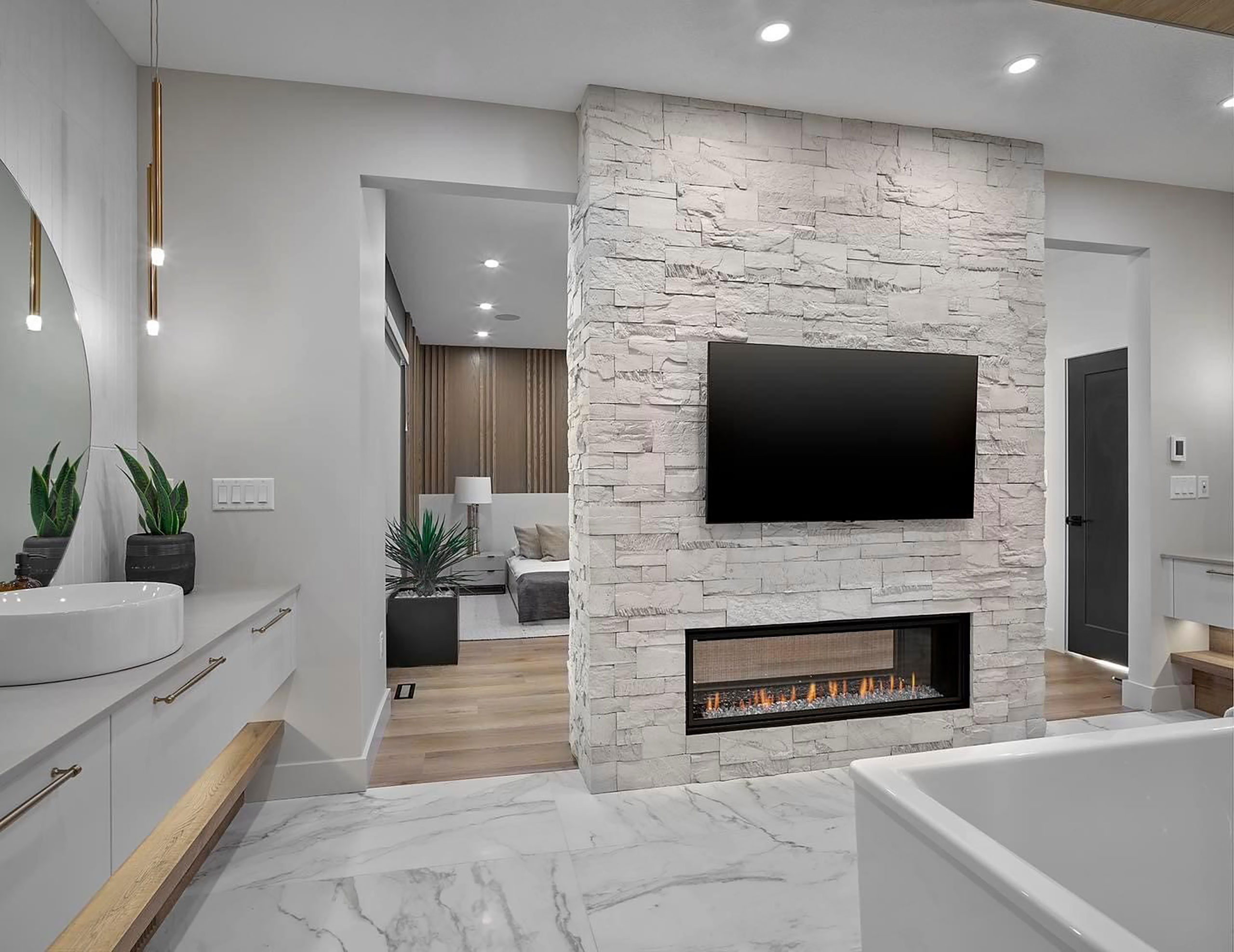 Woolsey Showhome in Edmonton is a beautifully done new build showcasing the residential area of Woolsey Lane. Masonry supplied by Timberstone Distribution using Creative Mines Lunar Split Modular stone. Installed by the masonry team at BRK Masonry. The builder is Vicky Kujundzic of Vicky’s Homes. Vicky’s approach to custom home building goes beyond simply producing homes—it’s about creating sanctuaries of luxury crafted with fine, attentive detail and inventive designs. Her dedication to quality and service is demonstrated in every aspect of her business. And she is a custom builder whose approach is hands-on throughout every aspect of the new home building process—from overseeing the design to managing the build construction.