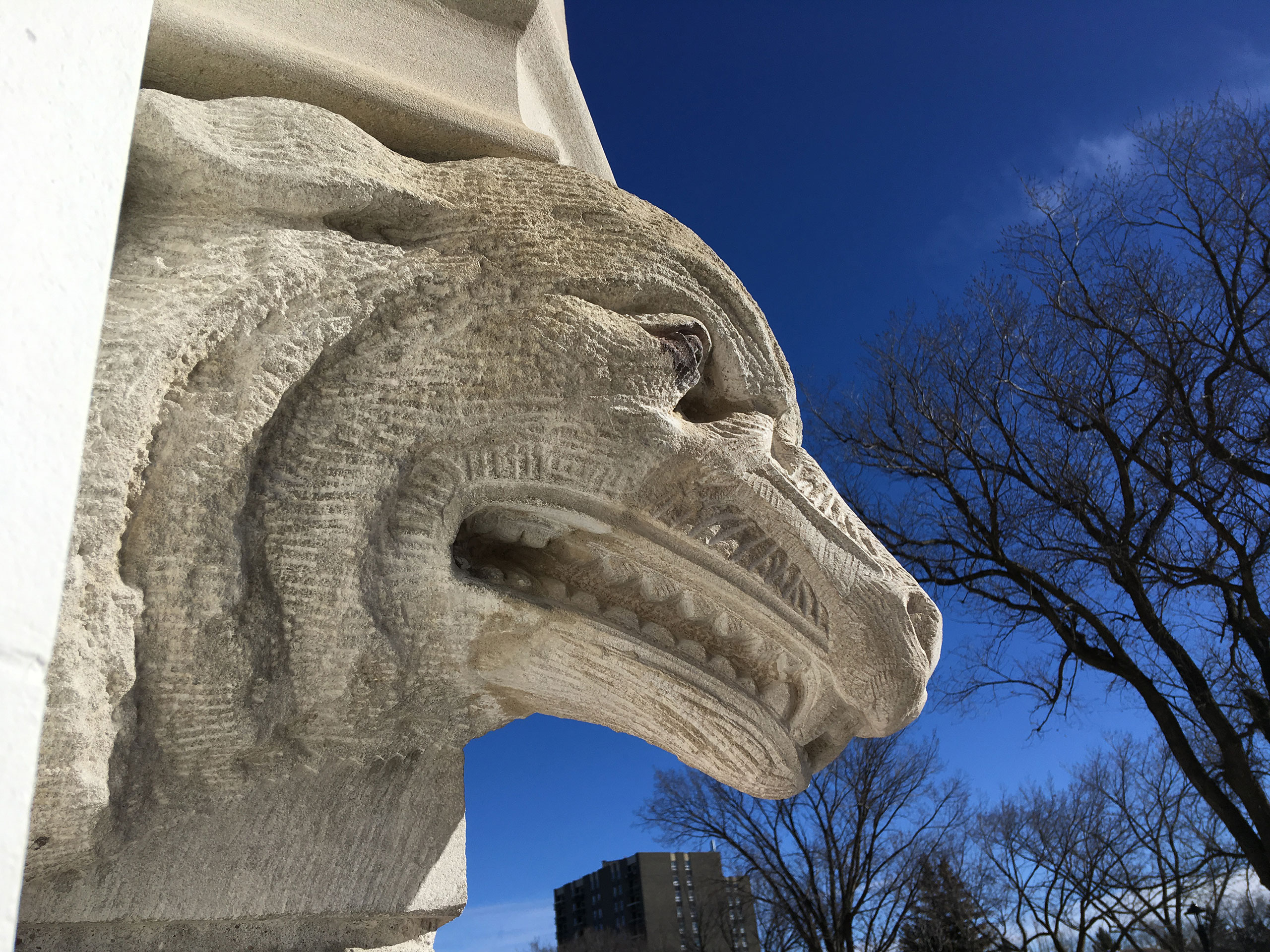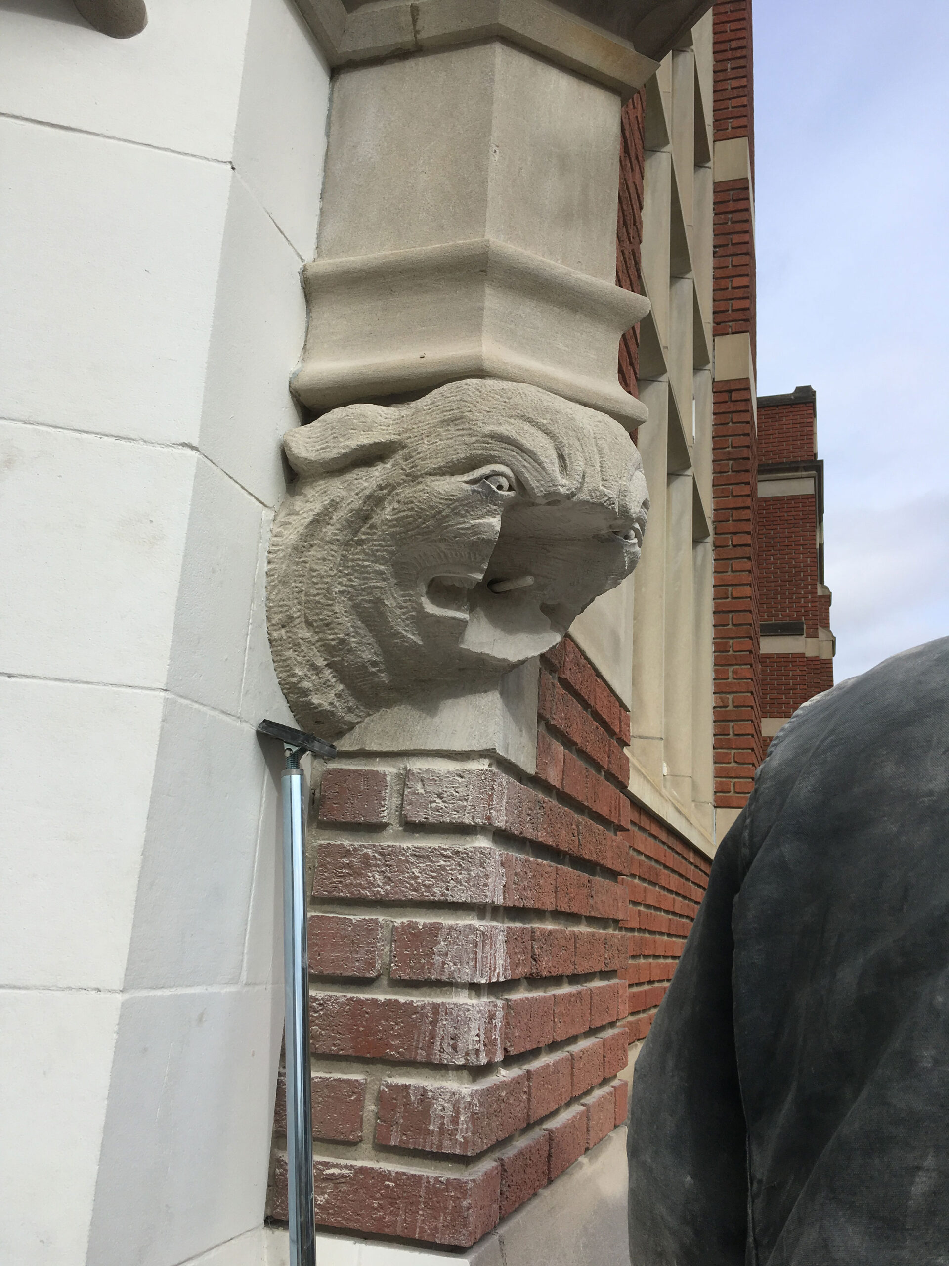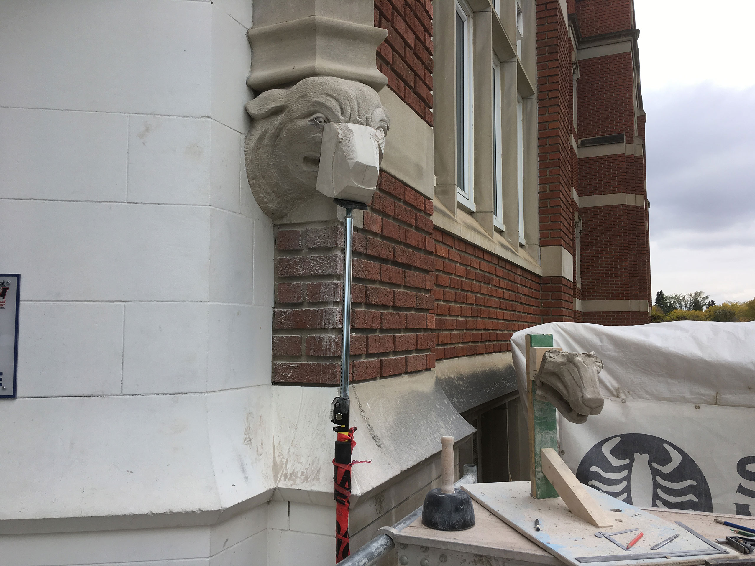 This project repaired and restored a non structural grotesque (gargoyle) at Edmonton’s Westmount School that exhibited heavy damage. Boreas Principal Darrel Babuk and Material Scientist Adam Crawford assessed the grotesque in accordance with The Standards and Guidelines for the Conservation of Historic Places in Canada. From this, it was determined to have been originally carved from Indiana Limestone. Two options were considered: restoration with modelling plaster, or a proper dutchman repair using Indiana Limestone. The dutchman repair option was chosen and approved by the Client as it cost only 3% more than the modelling plaster option and would be far more durable. In a serendipitous moment, we found that the Head Carver of Norway’s Stavenger Cathedral, Akira Inman was available, as he would be in Edmonton to celebrate a family birthday. From this, Scorpio Masonry located suitable limestone pieces that had been scraps from another project: Boreas evaluated and specified stainless steel pins, and Boreas and Scorpio together identified and evaluated historic lime based mortars that chemically behaved similar to limestone, to minimize any chance of mortar crackage or shrinkage. Akira’s contract was written so as to include presentations to the student body on his work as a stone carver; three students in turn sought information from their school guidance counsellor on careers in masonry trades. Repairing and restoring ‘November’ became a source of community pride.